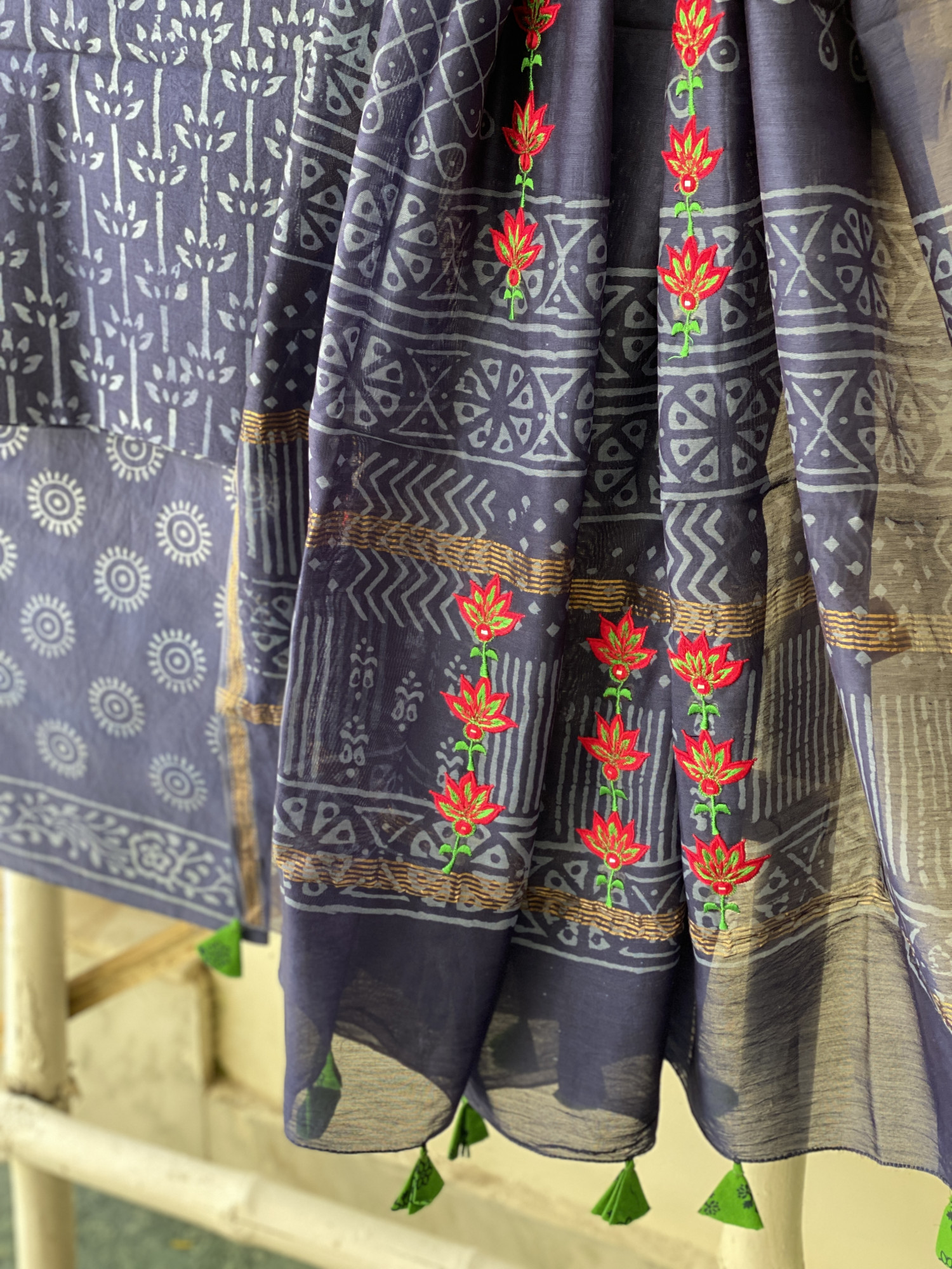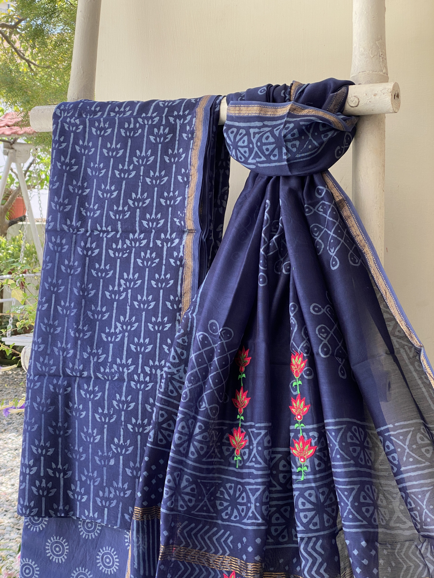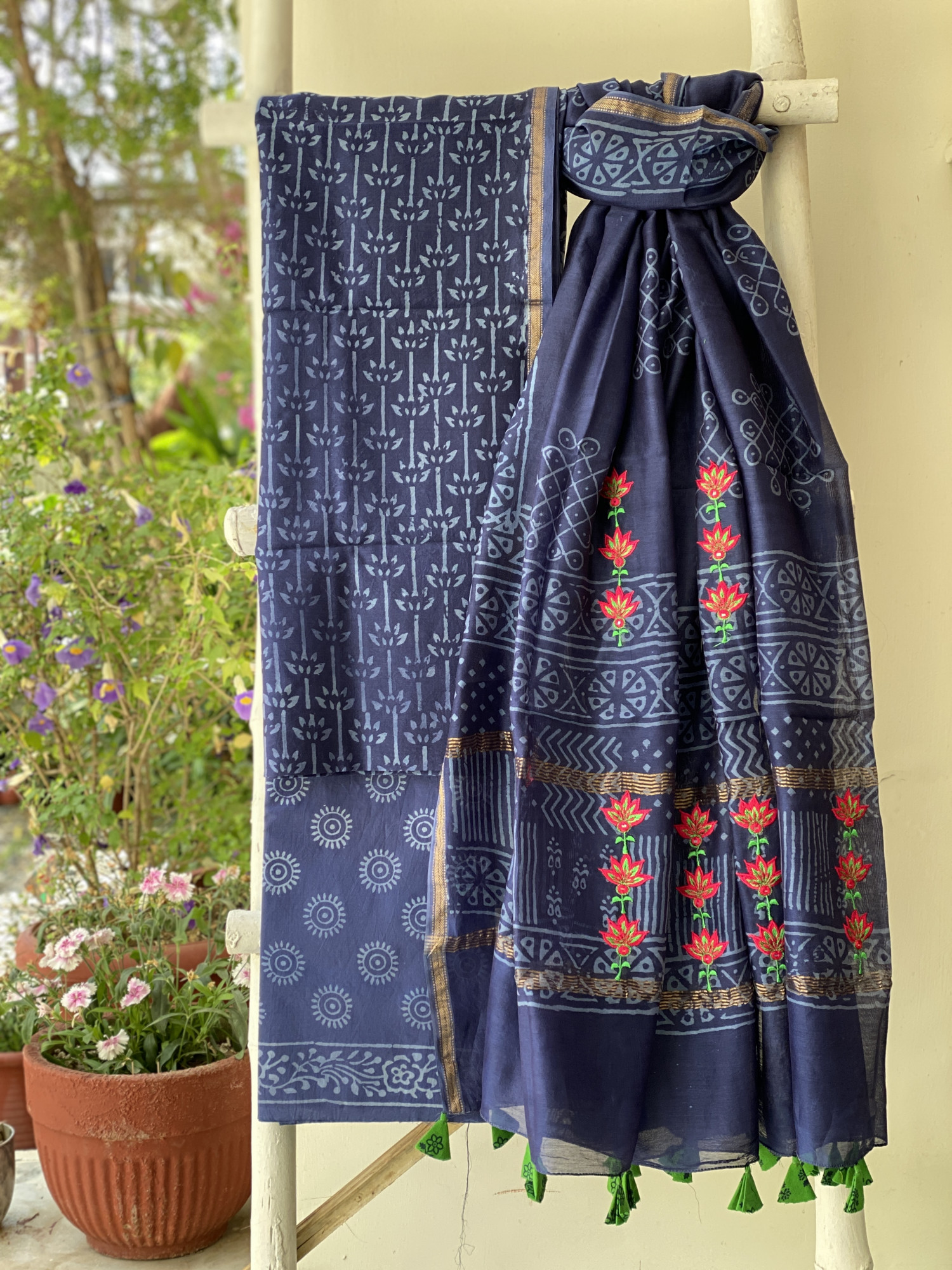 INDIGO CHANDERI COTTON BLOCK PRINT EMBROIDERED DUPATTA SET