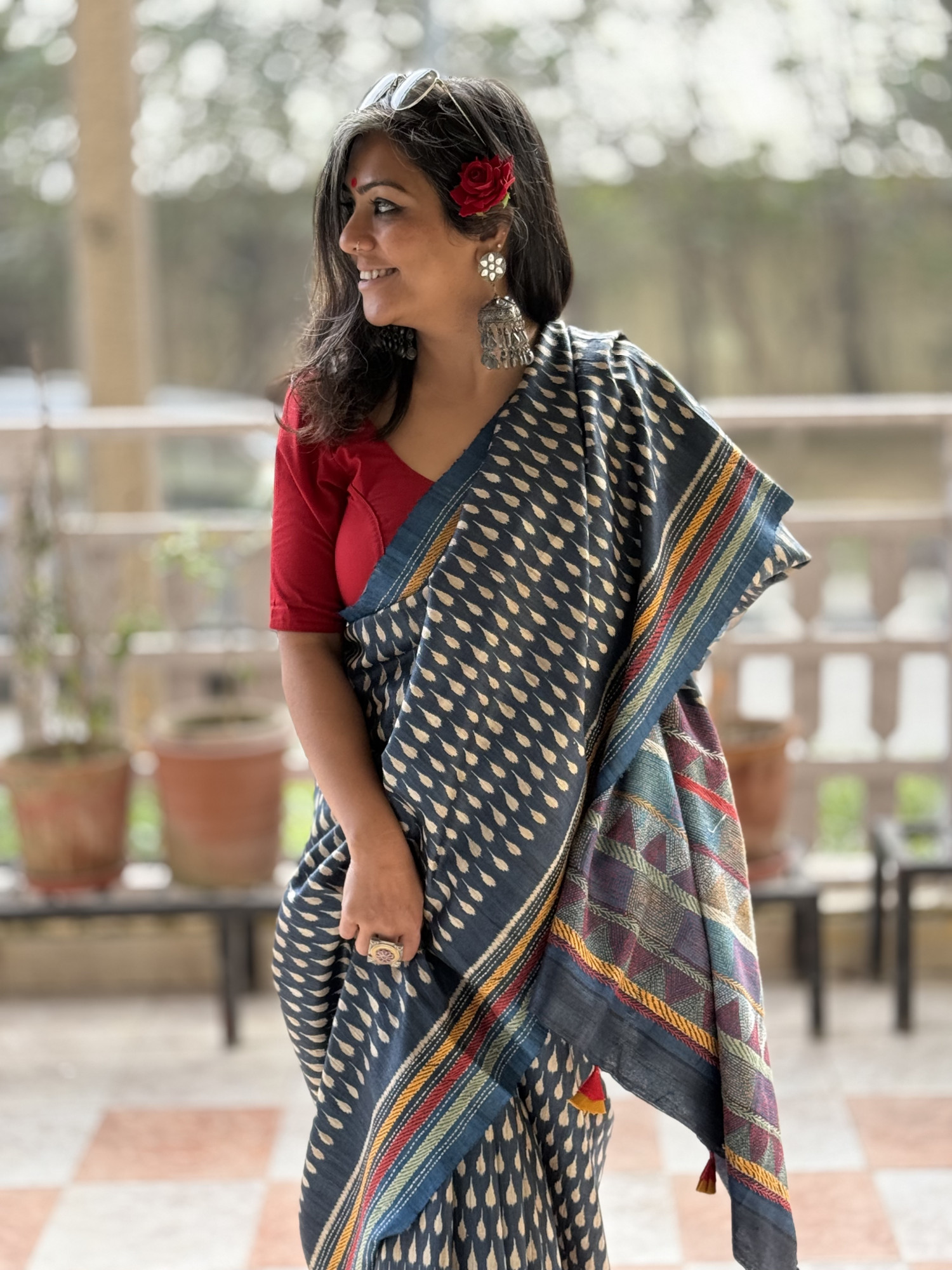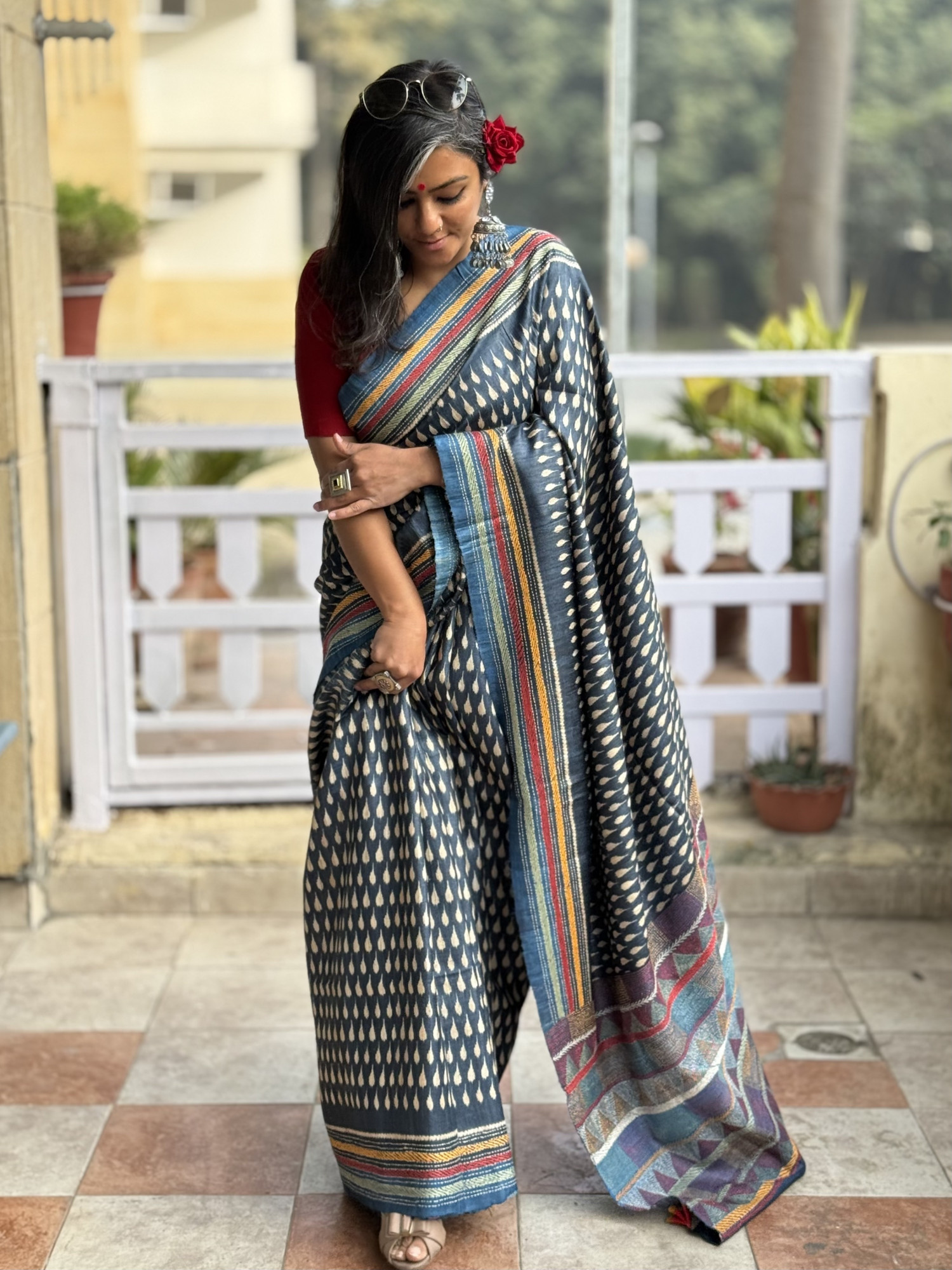 INDIGO HAND BLOCK PRINT GICHA TUSSAR SILK SARI, WITH KANTHA EMBROIDERED BORDER AND PALLA, ACCESSORISED WITH TASSLES.