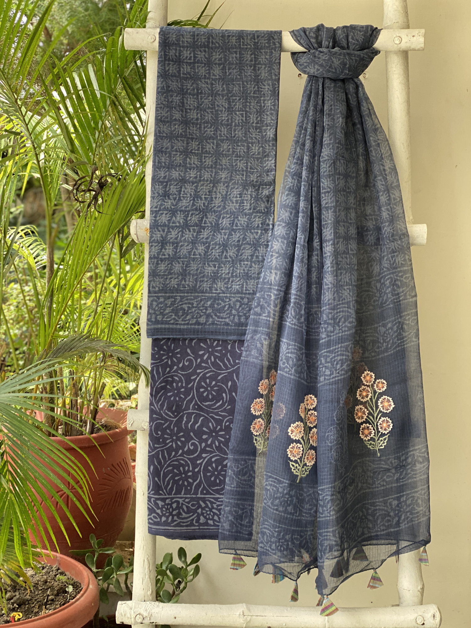 INDIGO "DABU" HAND BLOCK PRINT KOTA SHIRT AND AN INDIGO HAND BLOCK PRINTED COTTON BOTTOM PAIRED WITH AN INDIGO KOTA HAND BLOCK PRINT DUPATTA WITH MANUAL MACHINE EMBROIDERY, ACCESSORISED WITH TASSLES.