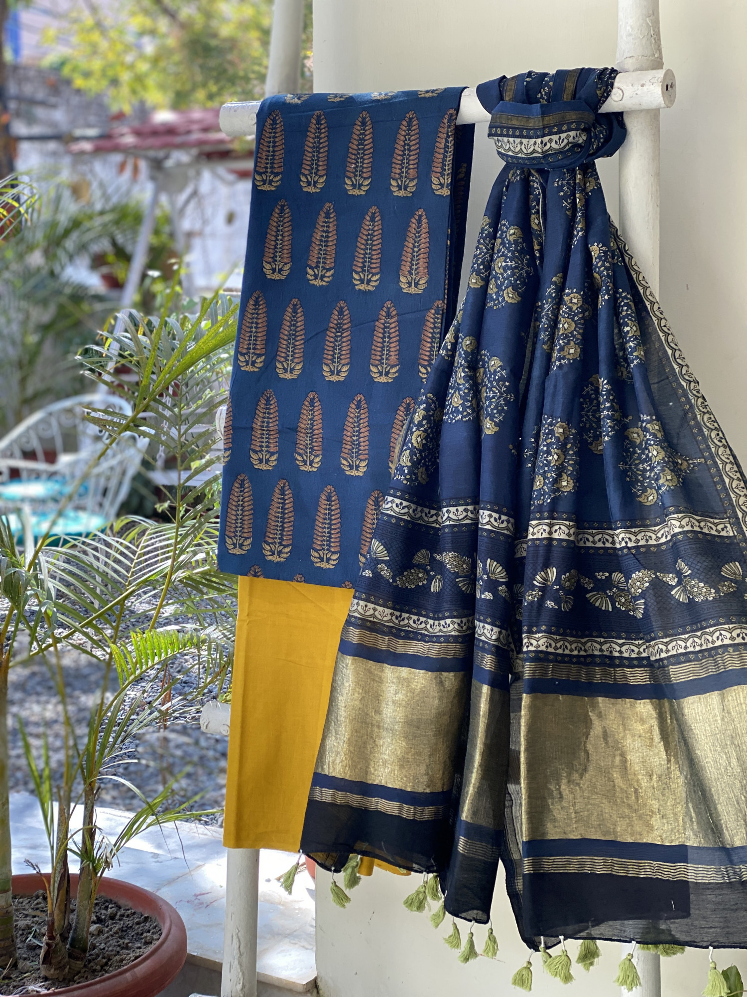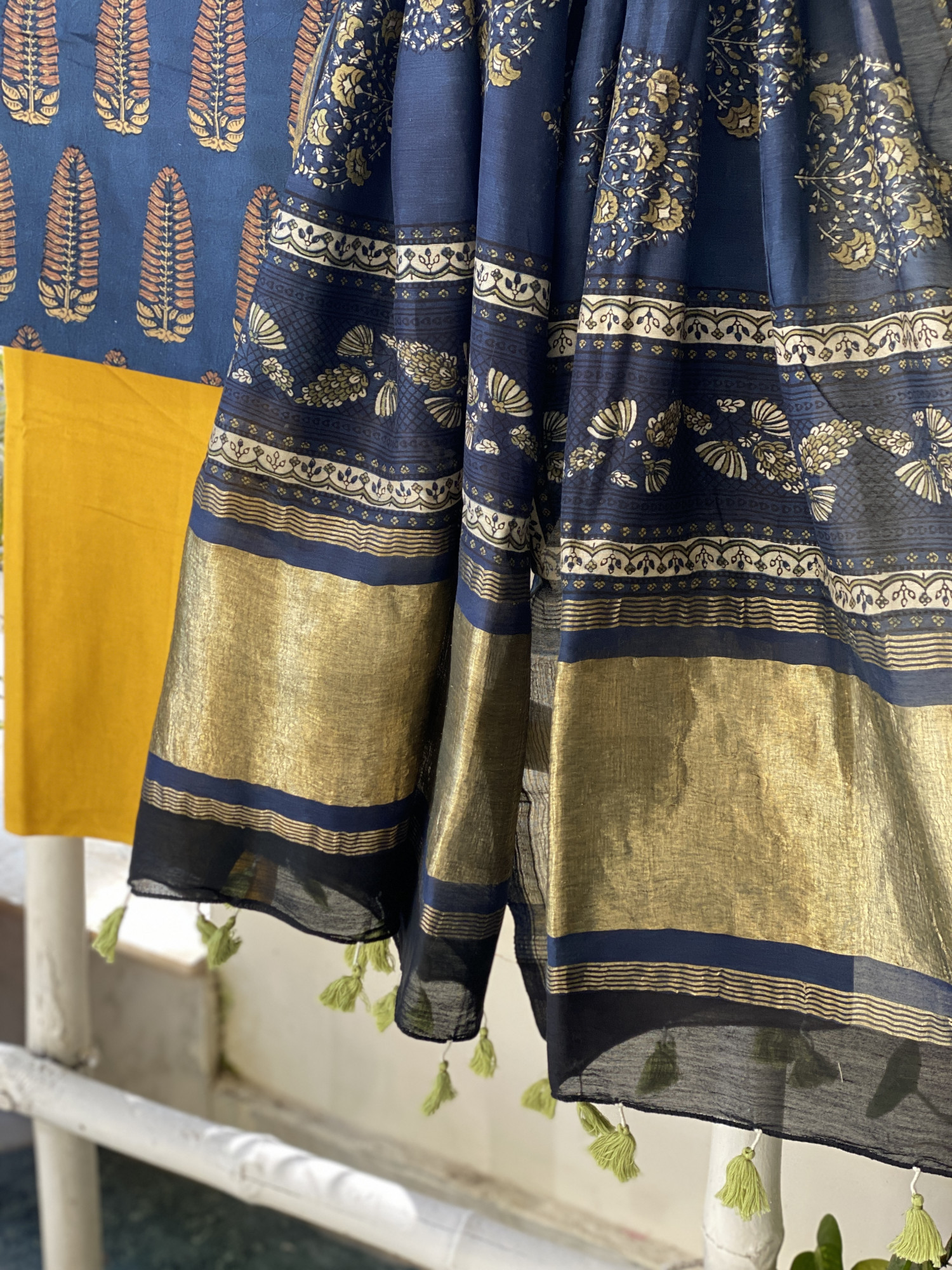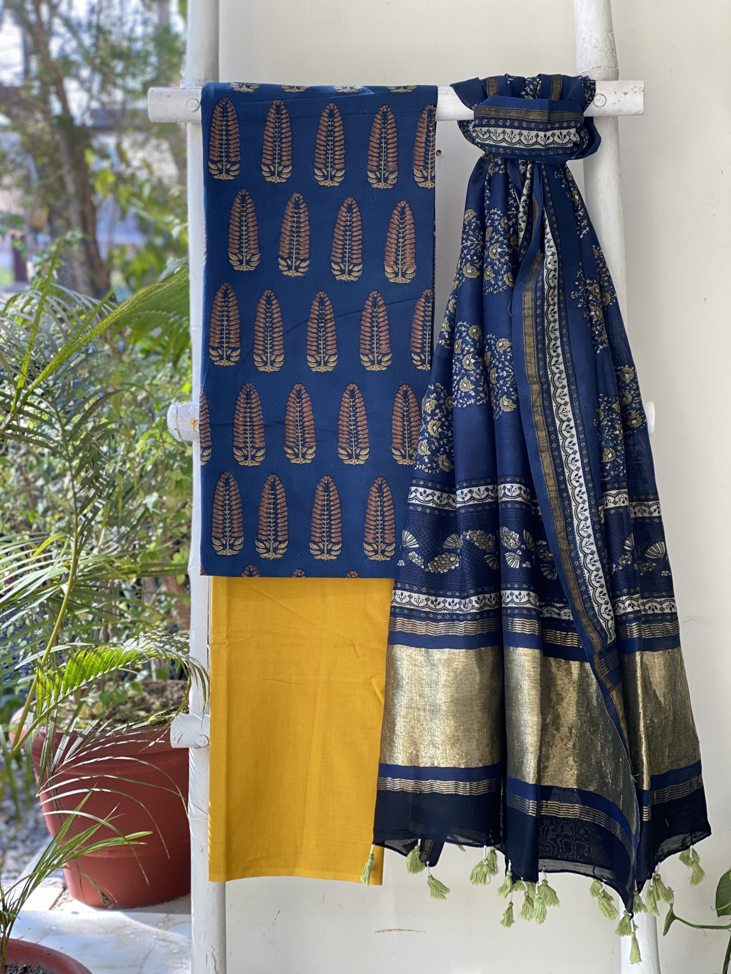INDIGO AJRAKH HAND BLOCK PRINT COTTON SHIRT AND A MUSTARD PLAIN COTTON BOTTOM PAIRED WITH AN INDIGO AJRAKH HAND BLOCK PRINT CHANDERI SILK AND COTTON DUPATTA WITH ZARI BORDERS, ACCESSORISED WITH TASSLES.