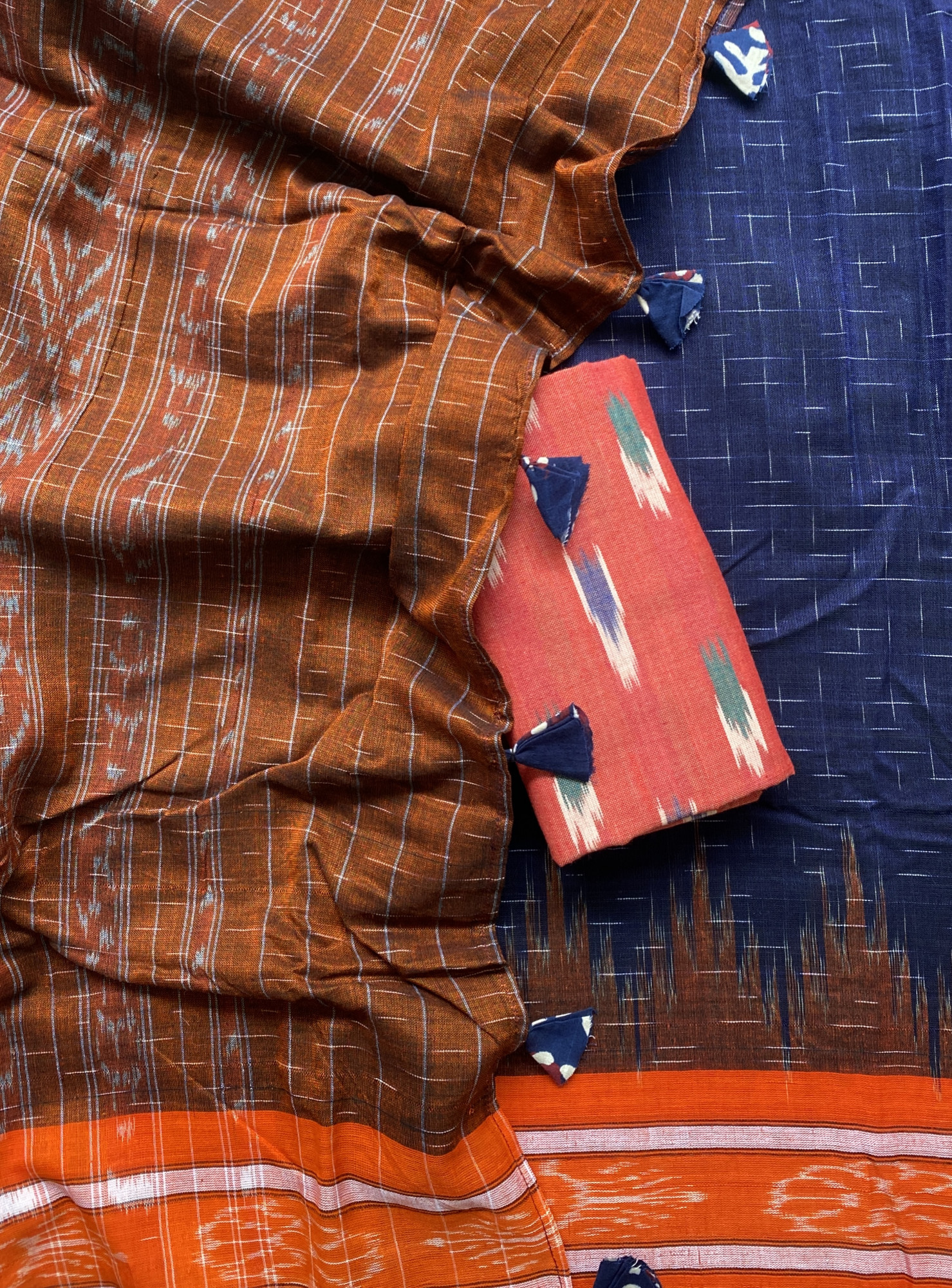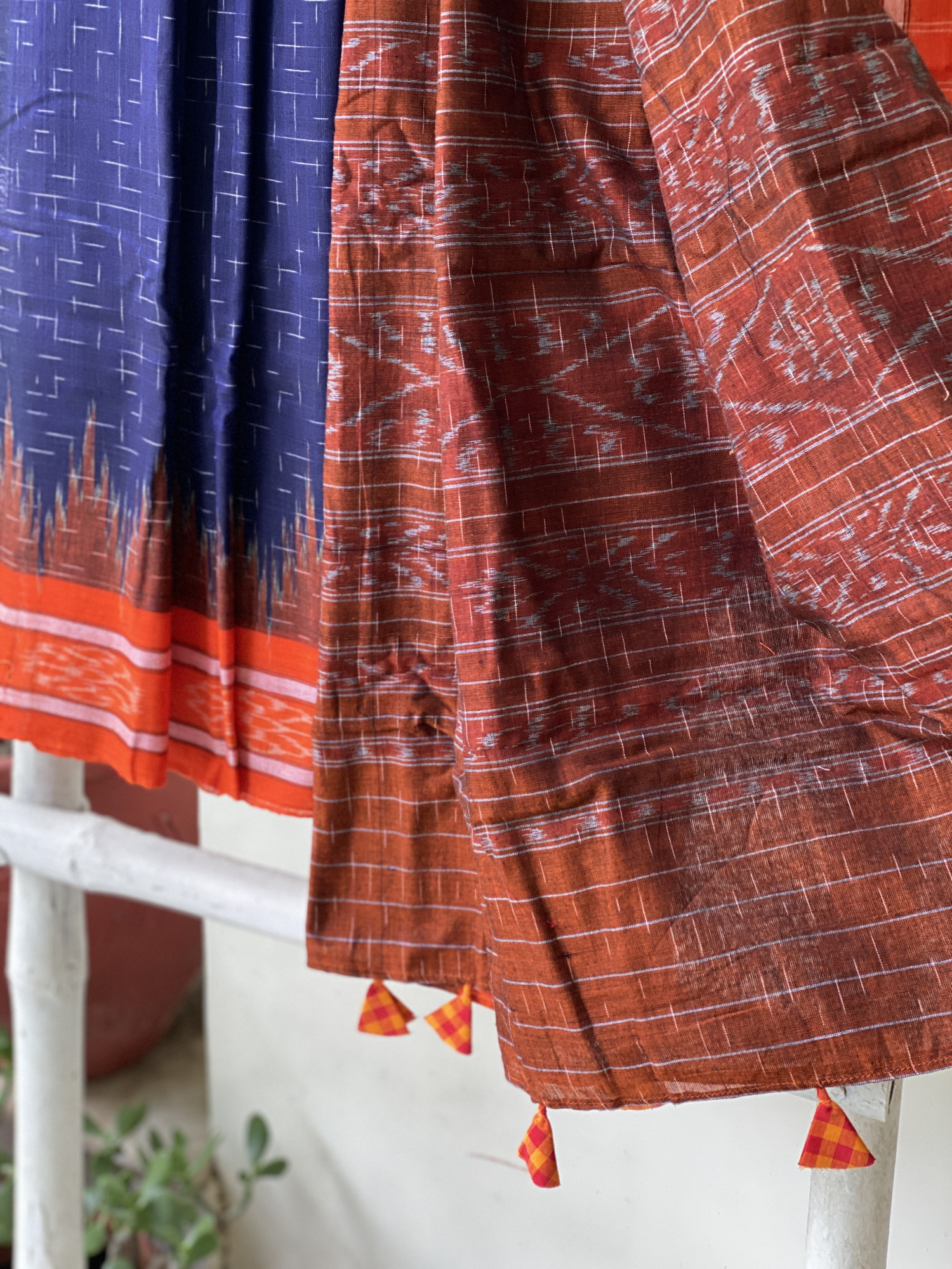 INDIGO-ORANGE cotton 'JHARNA ' IKKAT woven sari accessorized with tassels.