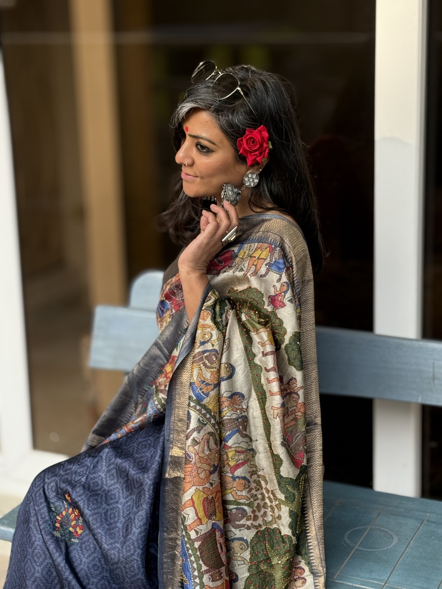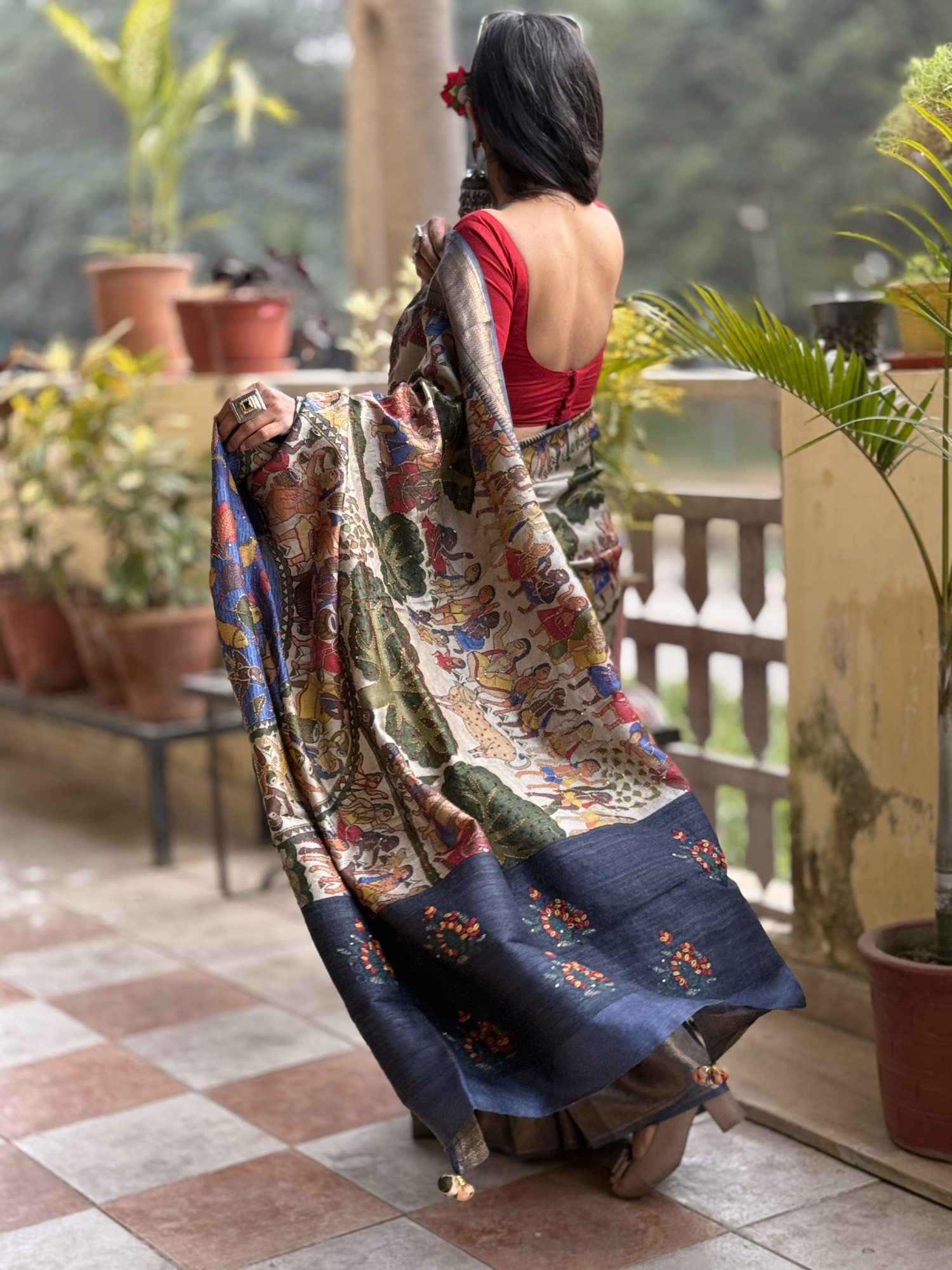 INDIGO SOFT TUSSAR SILK SARI WITH HAND EMBROIDERED MOTIFS ALL OVER, ZARI WOVEN BORDER AND PRINTED PALLA WITH HAND EMBROIDERY, ACCESSORISED WITH TASSLES.