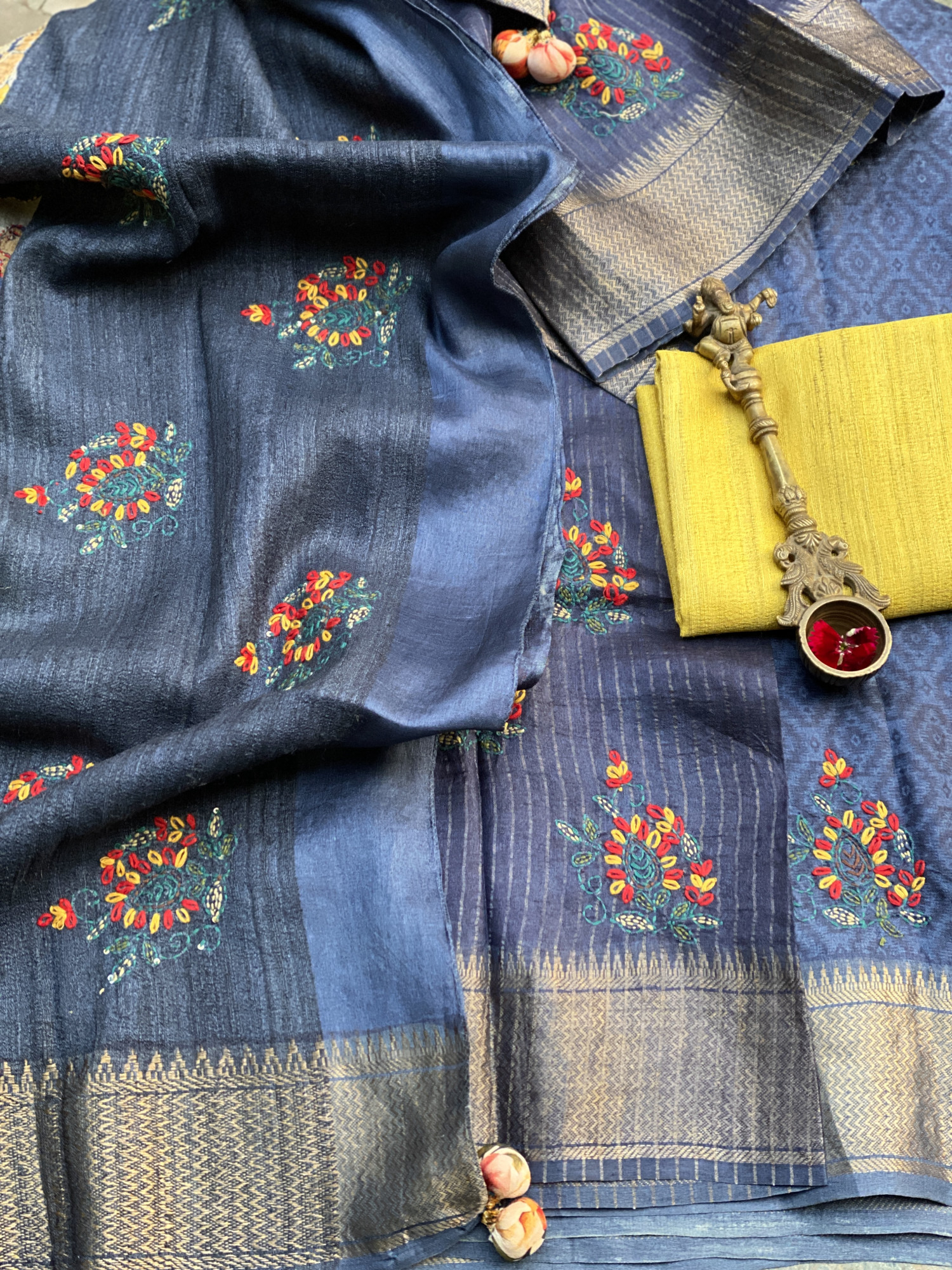 COMES WITH ITS OWN INDIGO TUSSAR SILK BLOUSE WITH ZARI BORDER And HAND EMBROIDERY AND AN EXTRA YELLOW GICHA TUSSAR SILK BLOUSE PIECE (90 CMS)