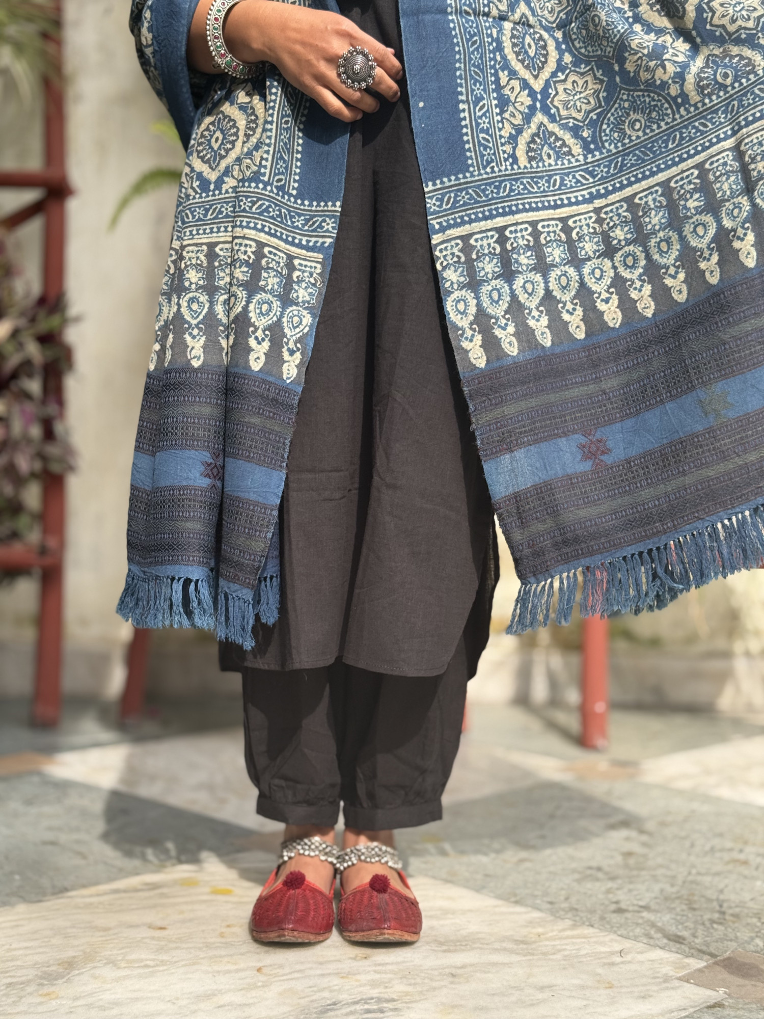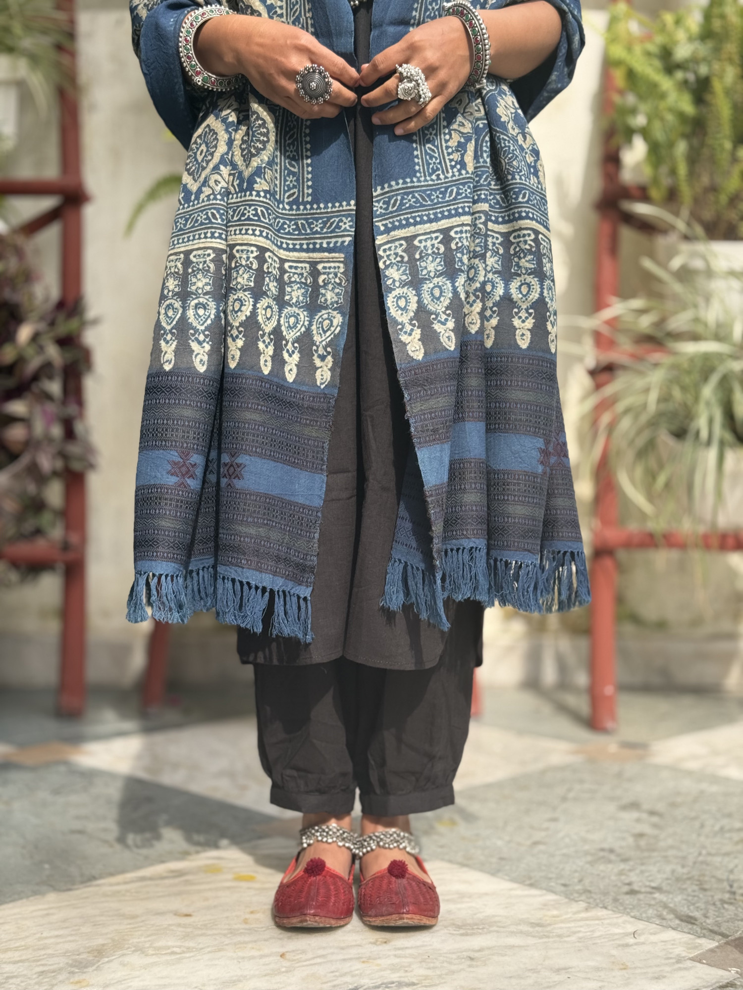 INDIGO pure merino wool handblock print ajrakh shawl WITH WOVEN BORDER.