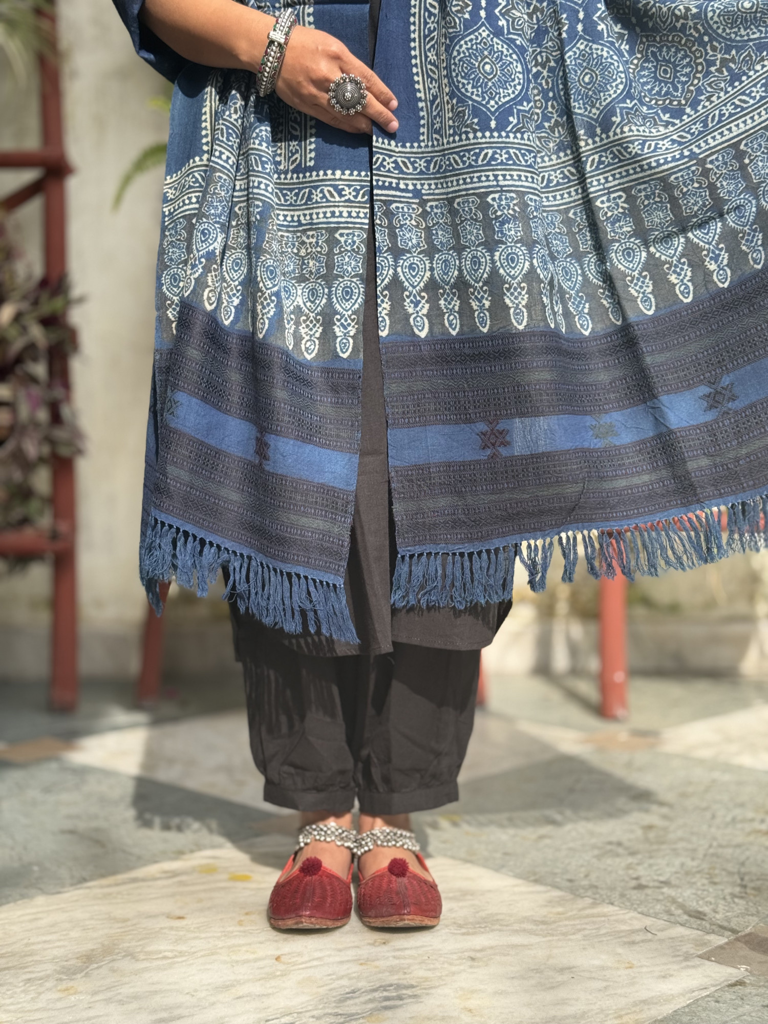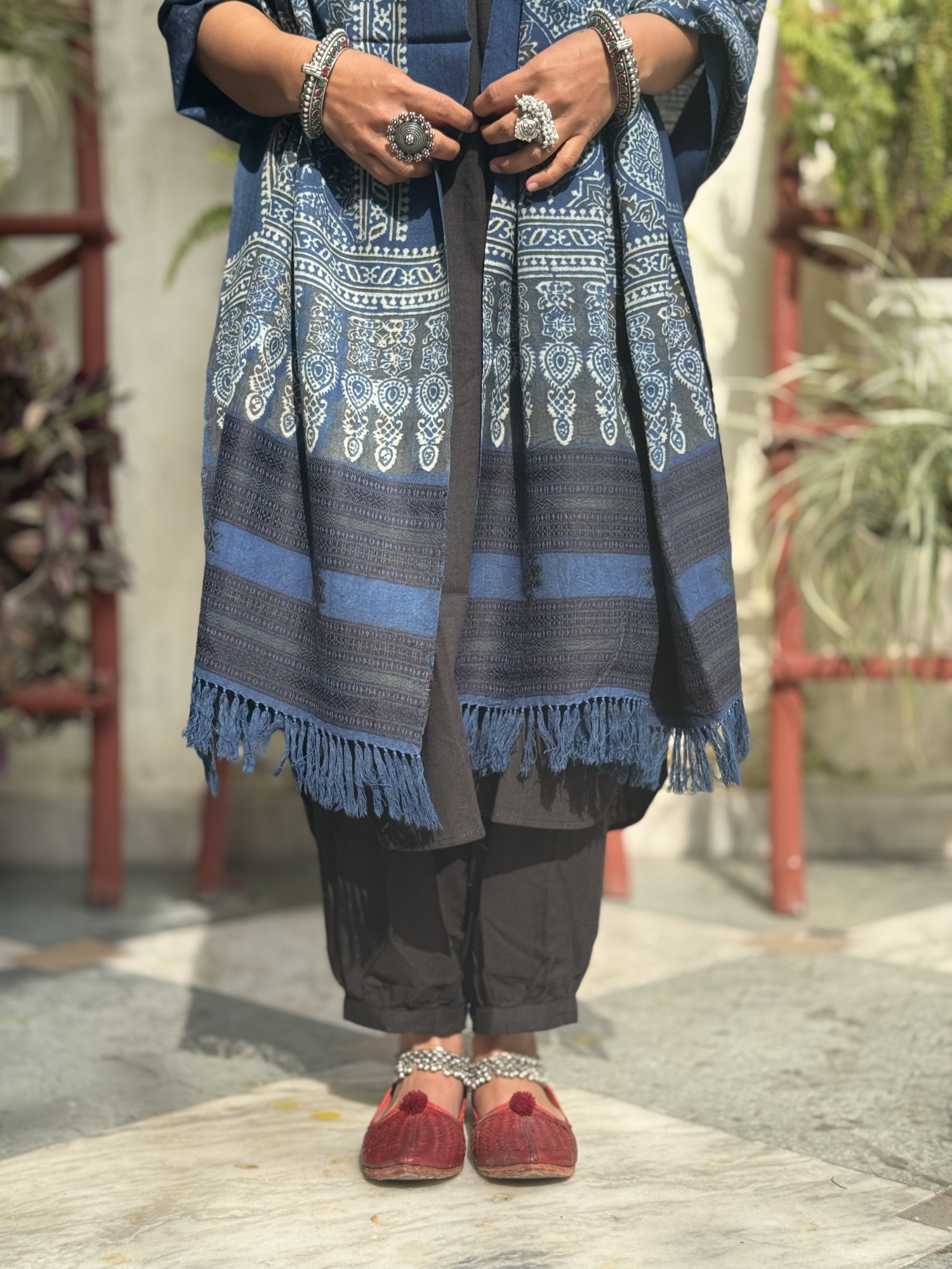 INDIGO pure merino wool handblock print ajrakh shawl WITH WOVEN BORDER.