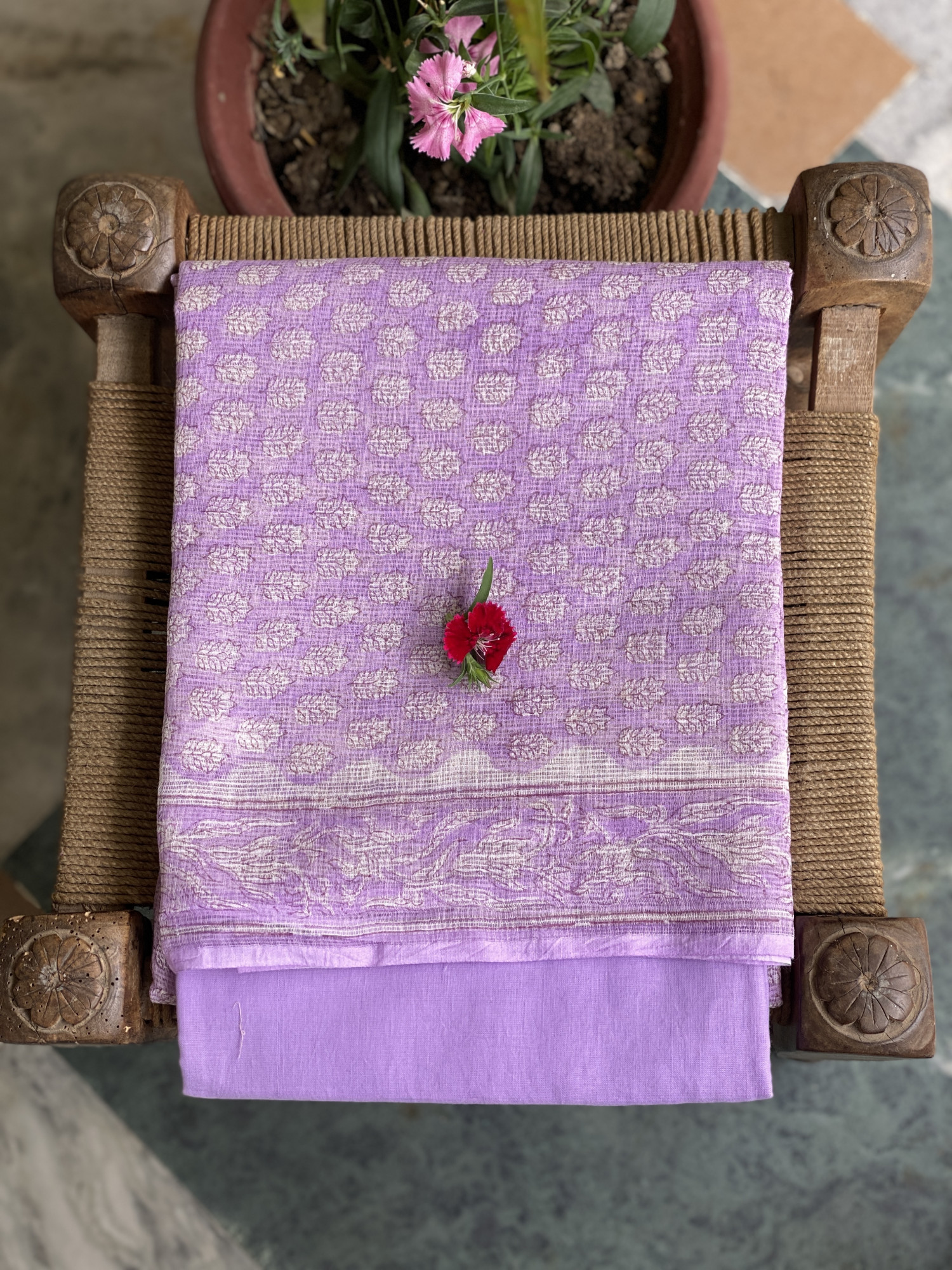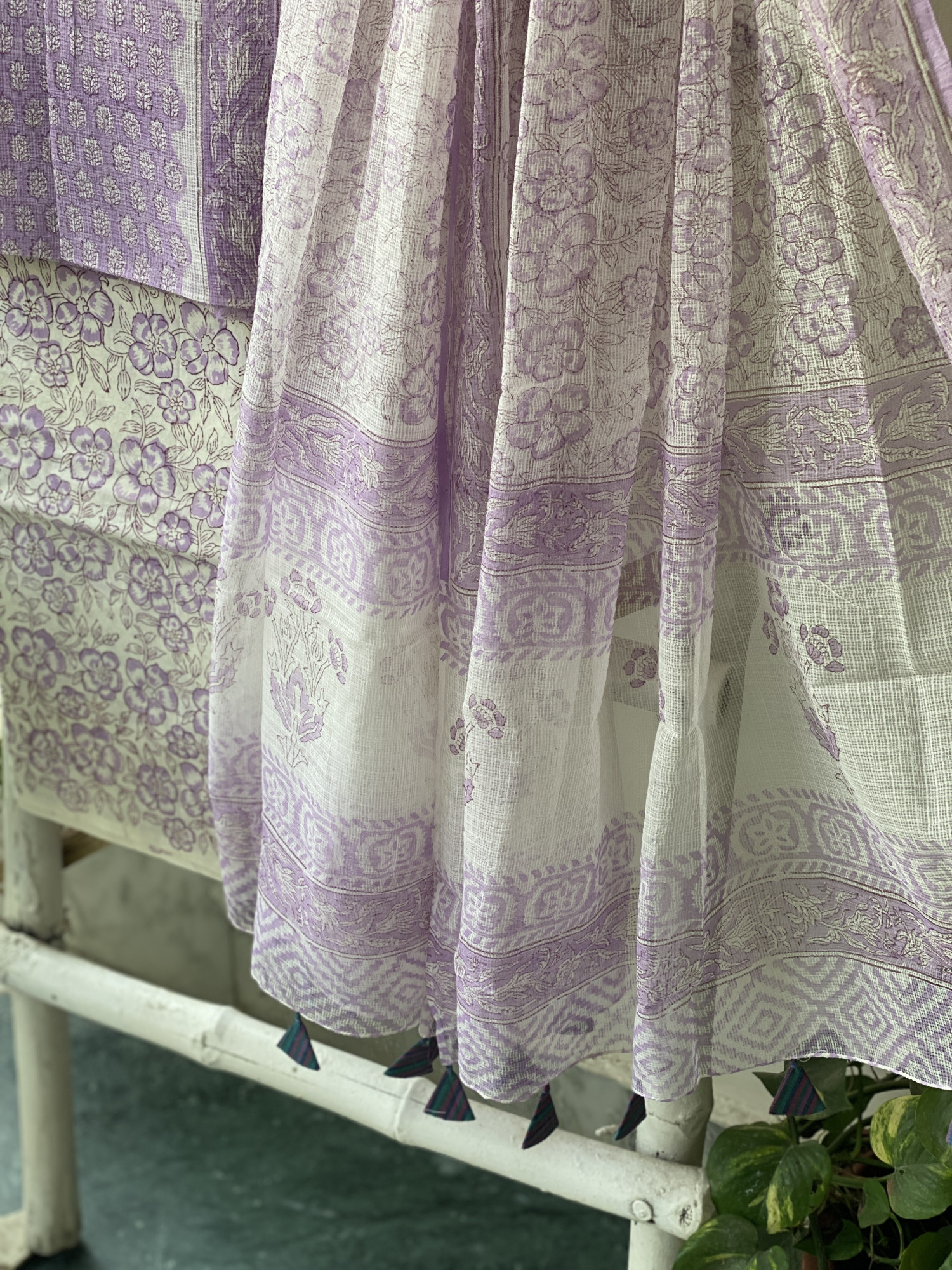 LAVENDER HAND BLOCK PRINT KOTA SHIRT (COMES WITH A MATCHING COTTON LINING PIECE) AND AN OFF WHITE COTTON BLOCK PRINT BOTTOM PAIRED WITH AN OFF WHITE KOTA BLOCK PRINT DUPATTA, ACCESSORISED WITH TASSLES.