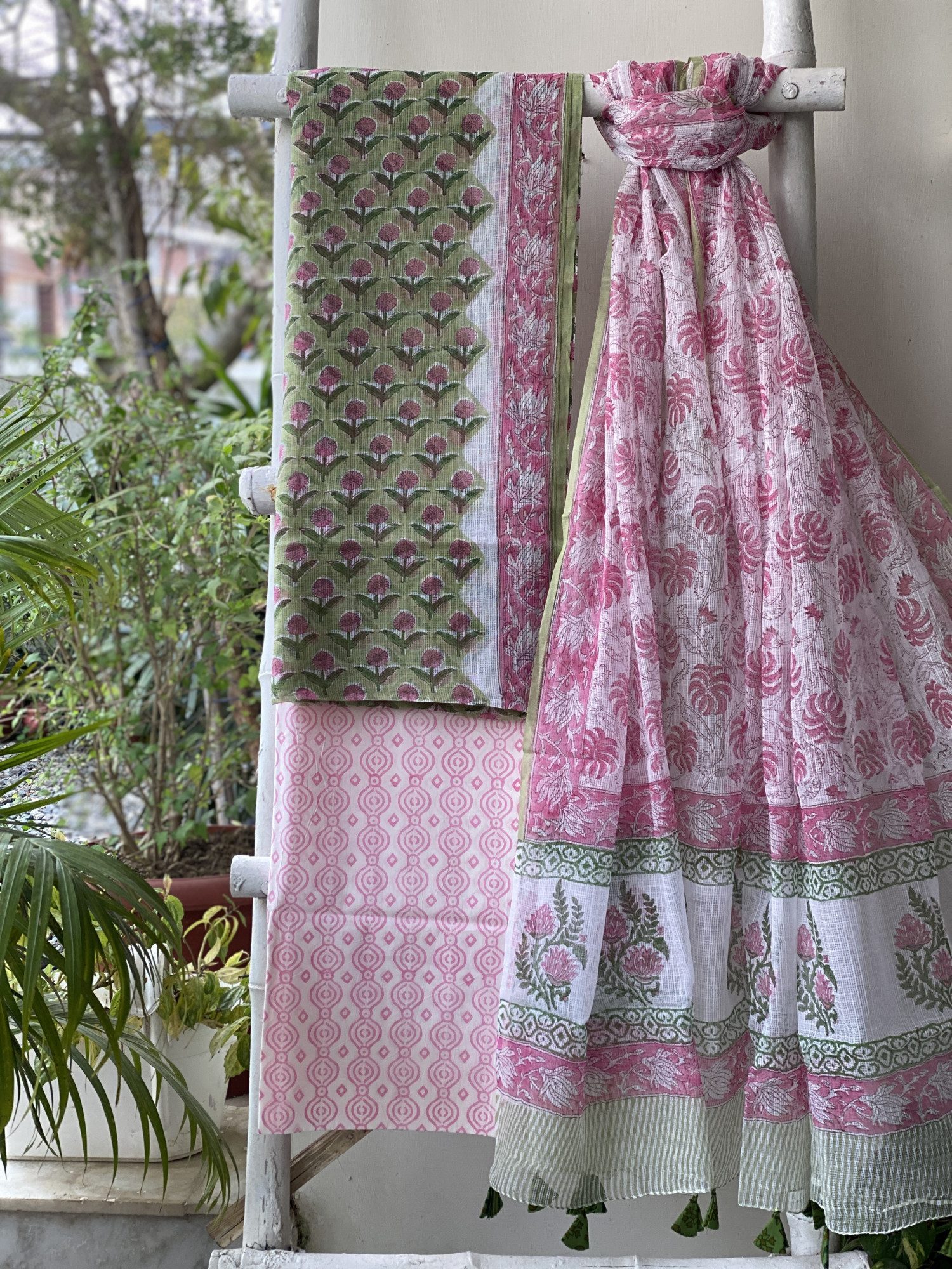 LIME GREEN HAND BLOCK PRINT KOTA SHIRT (COMES WITH A MATCHING COTTON LINING PIECE) AND AN OFF WHITE COTTON BLOCK PRINT BOTTOM PAIRED WITH AN OFF WHITE KOTA BLOCK PRINT DUPATTA, ACCESSORISED WITH TASSLES.