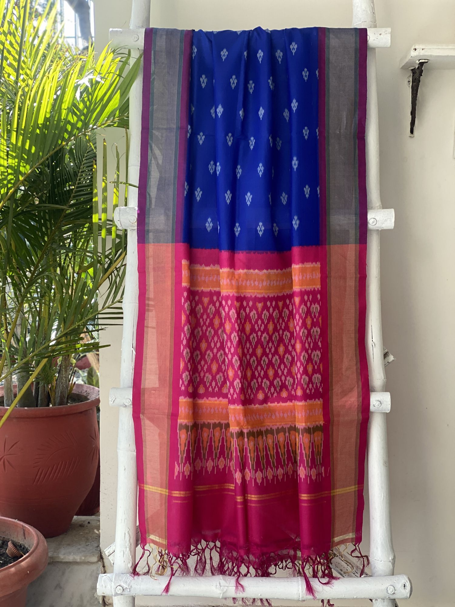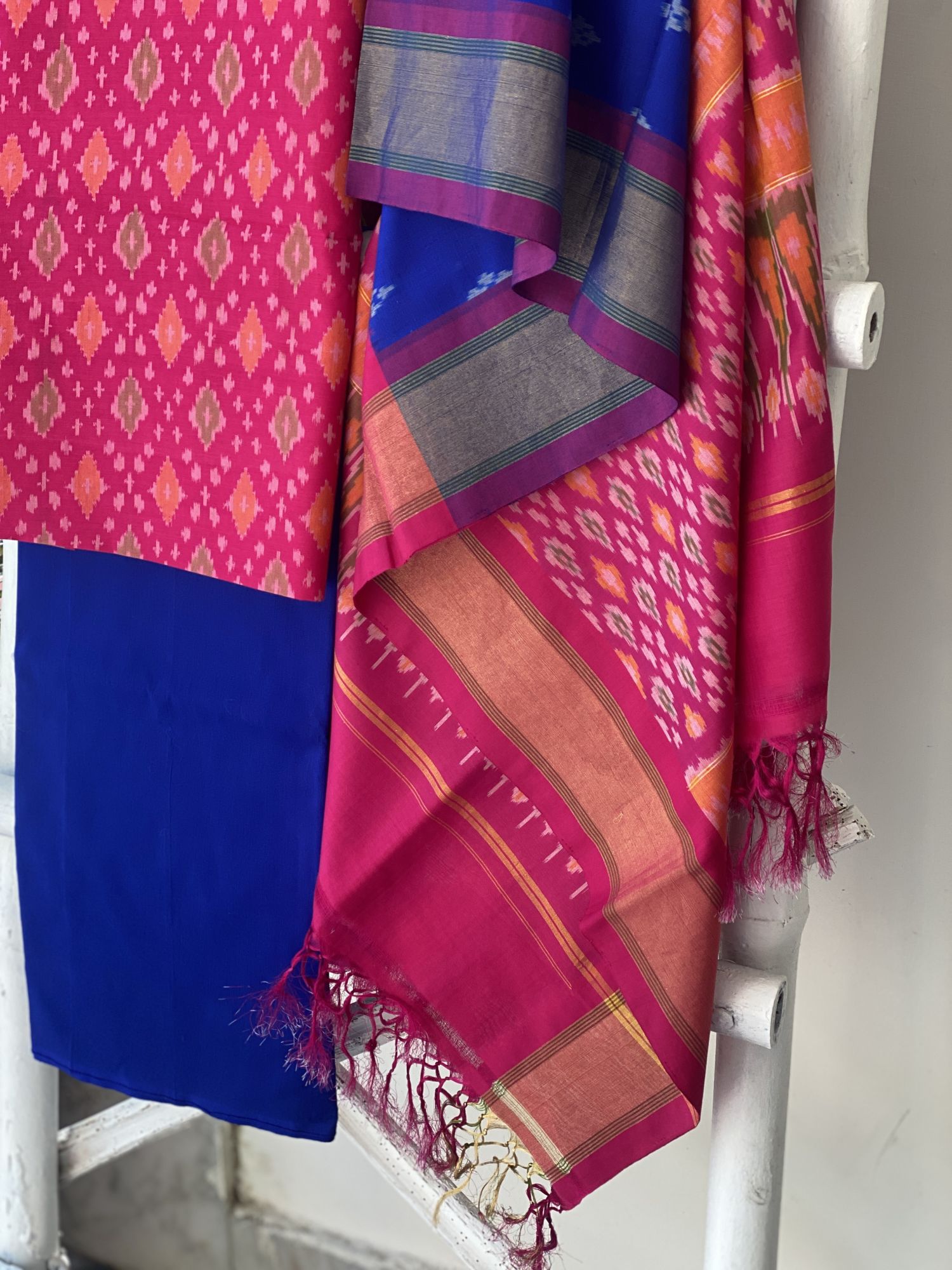 MAGENTA WOVEN IKKAT PURE SILK SHIRT AND PLAIN BLUE PURE SILK BOTTOM PAIRED WITH A MAGENTA-BLUE WOVEN IKKAT PURE SILK DUPATTA WITH ZARI BORDER.