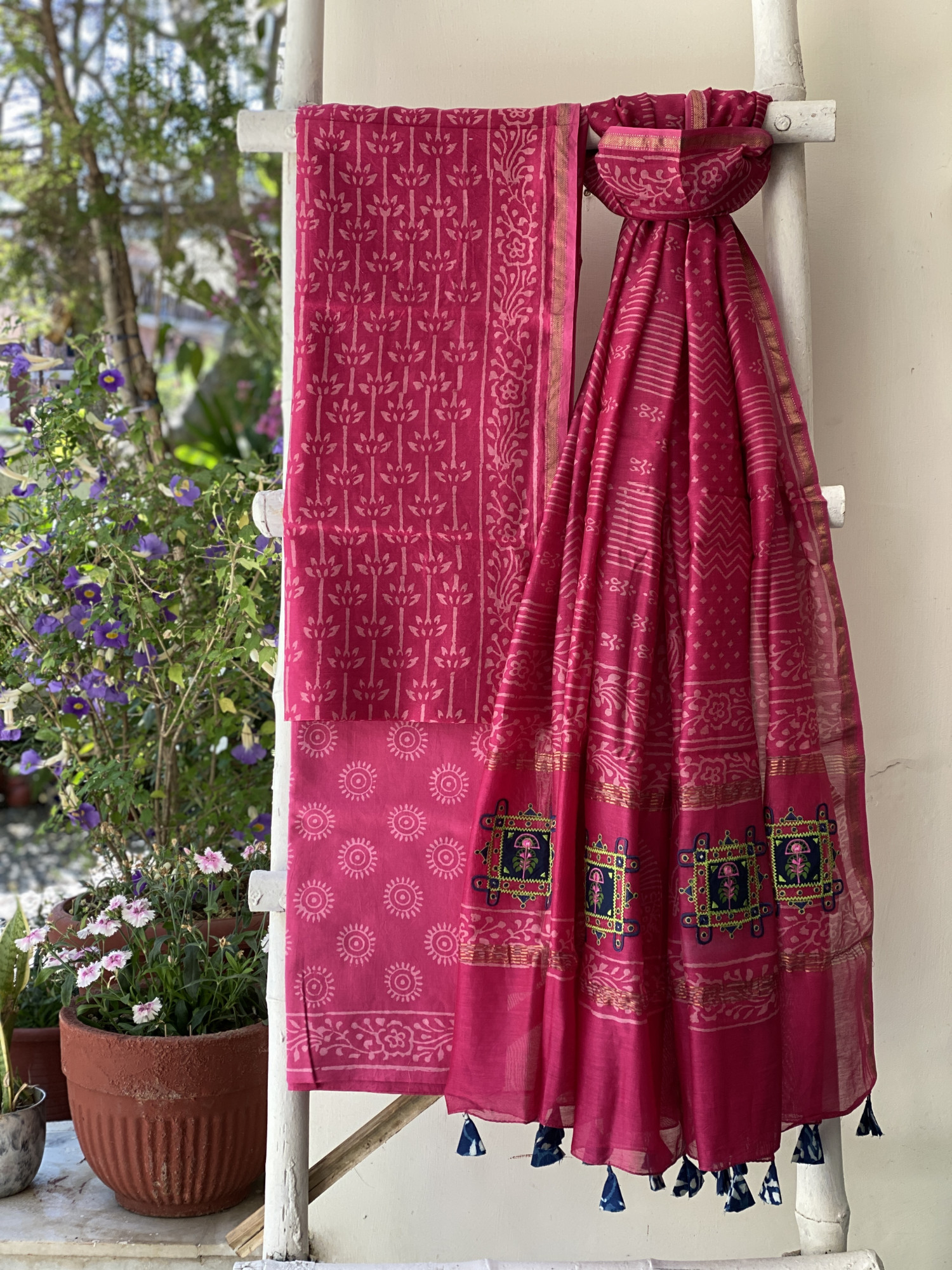 MAGENTA CHANDERI COTTON BLOCK PRINT EMBROIDERED DUPATTA SET