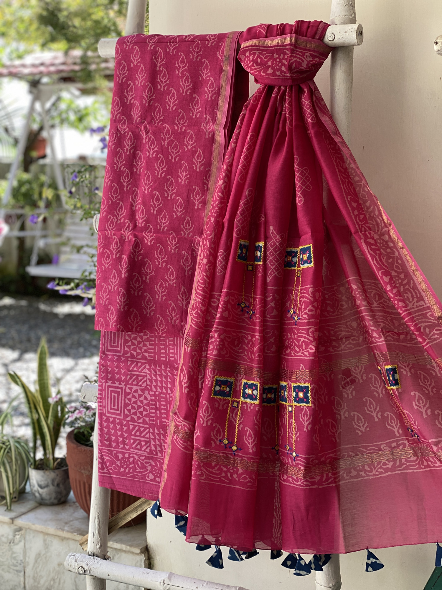 MAGENTA CHANDERI cotton silk block print shirt with MAGENTA BLOCK PRINT COTTON BOTTOM  paired with A MAGENTA CHANDERI silk and cotton BLOCK PRINT DUPATTA WITH MANUAL MACHINE EMBROIDERY, accessorised with tassles.