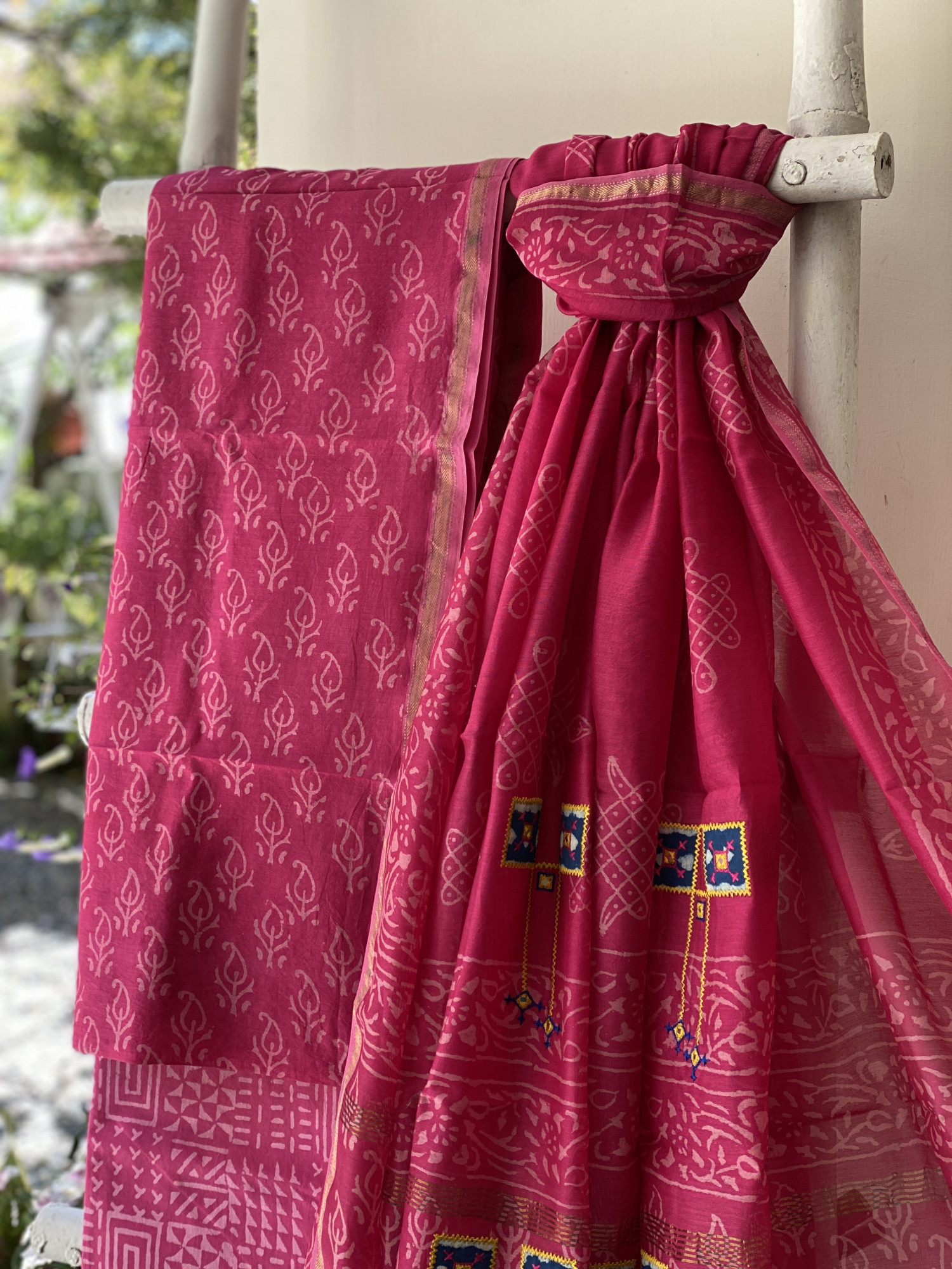MAGENTA CHANDERI COTTON BLOCK PRINT EMBROIDERED DUPATTA SET
