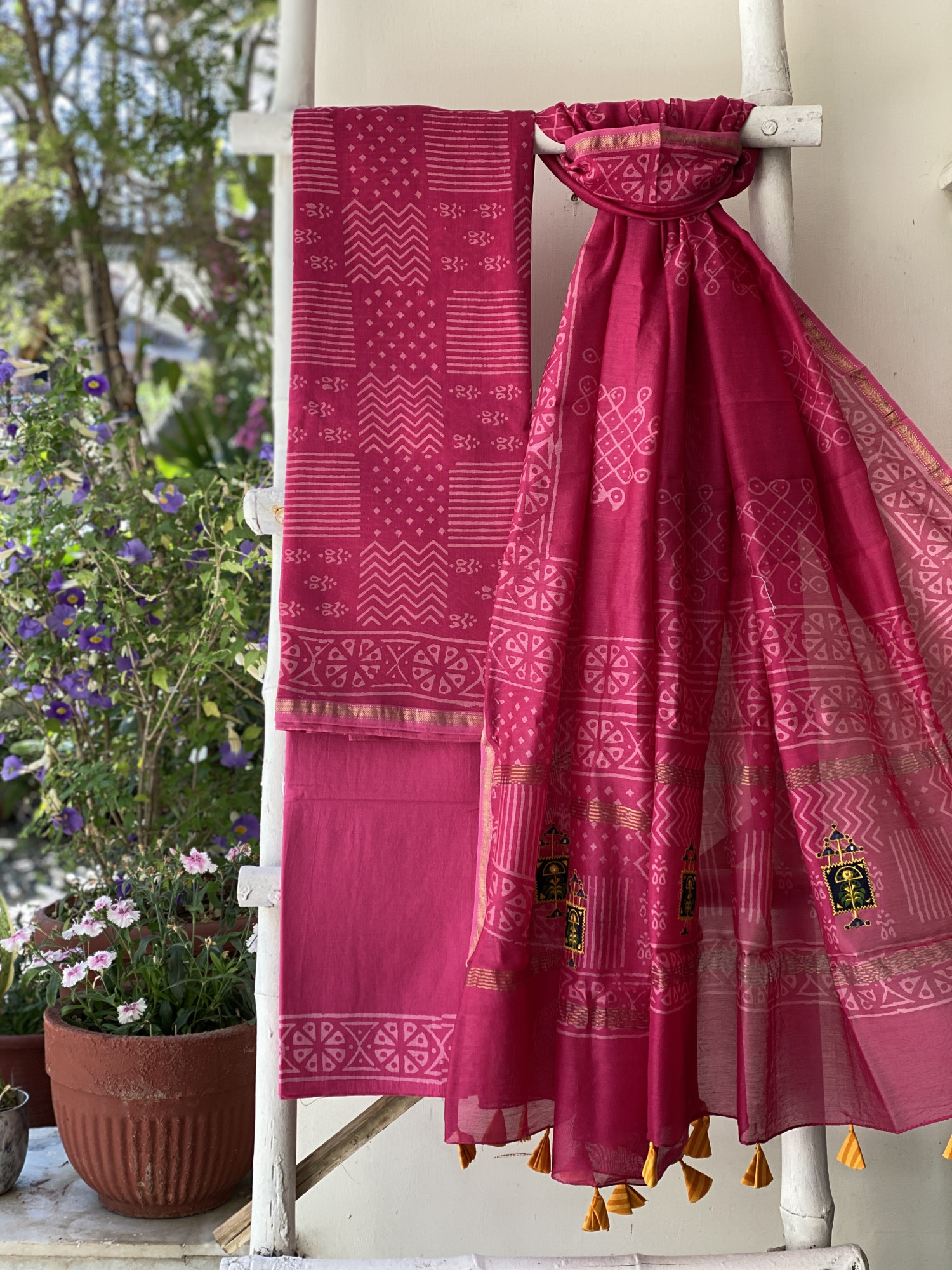 MAGENTA CHANDERI cotton silk block print shirt with MAGENTA BLOCK PRINT COTTON BOTTOM  paired with A MAGENTA CHANDERI silk and cotton BLOCK PRINT DUPATTA WITH MANUAL MACHINE EMBROIDERY, accessorised with tassles.