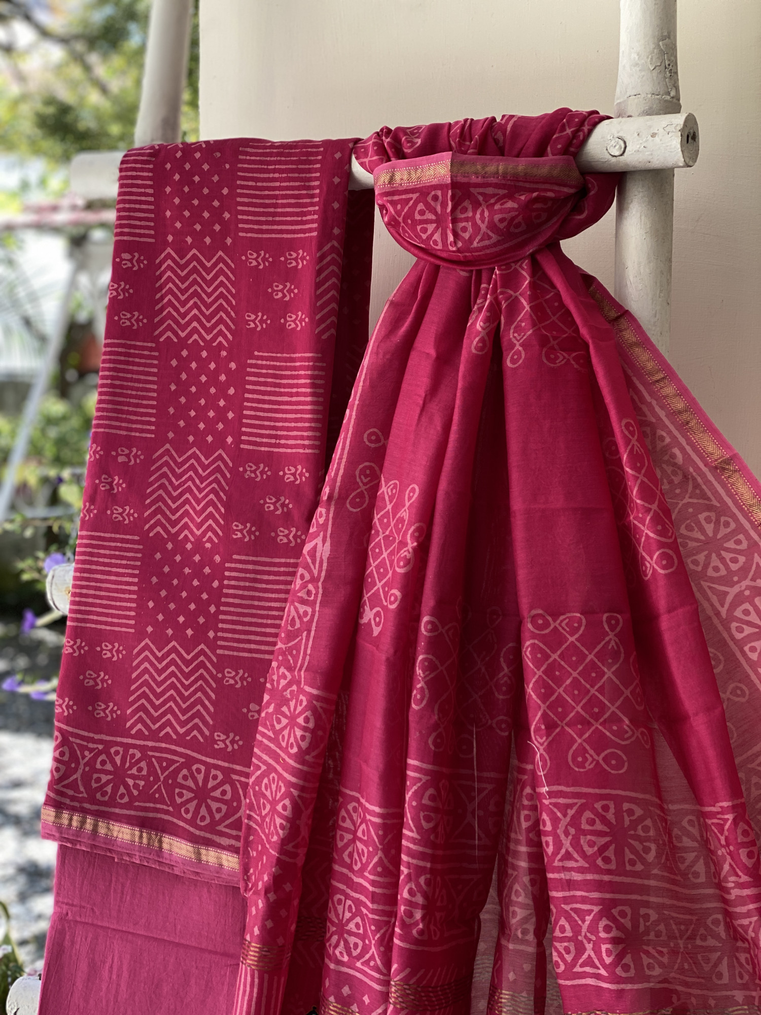 MAGENTA CHANDERI COTTON BLOCK PRINT EMBROIDERED DUPATTA SET
