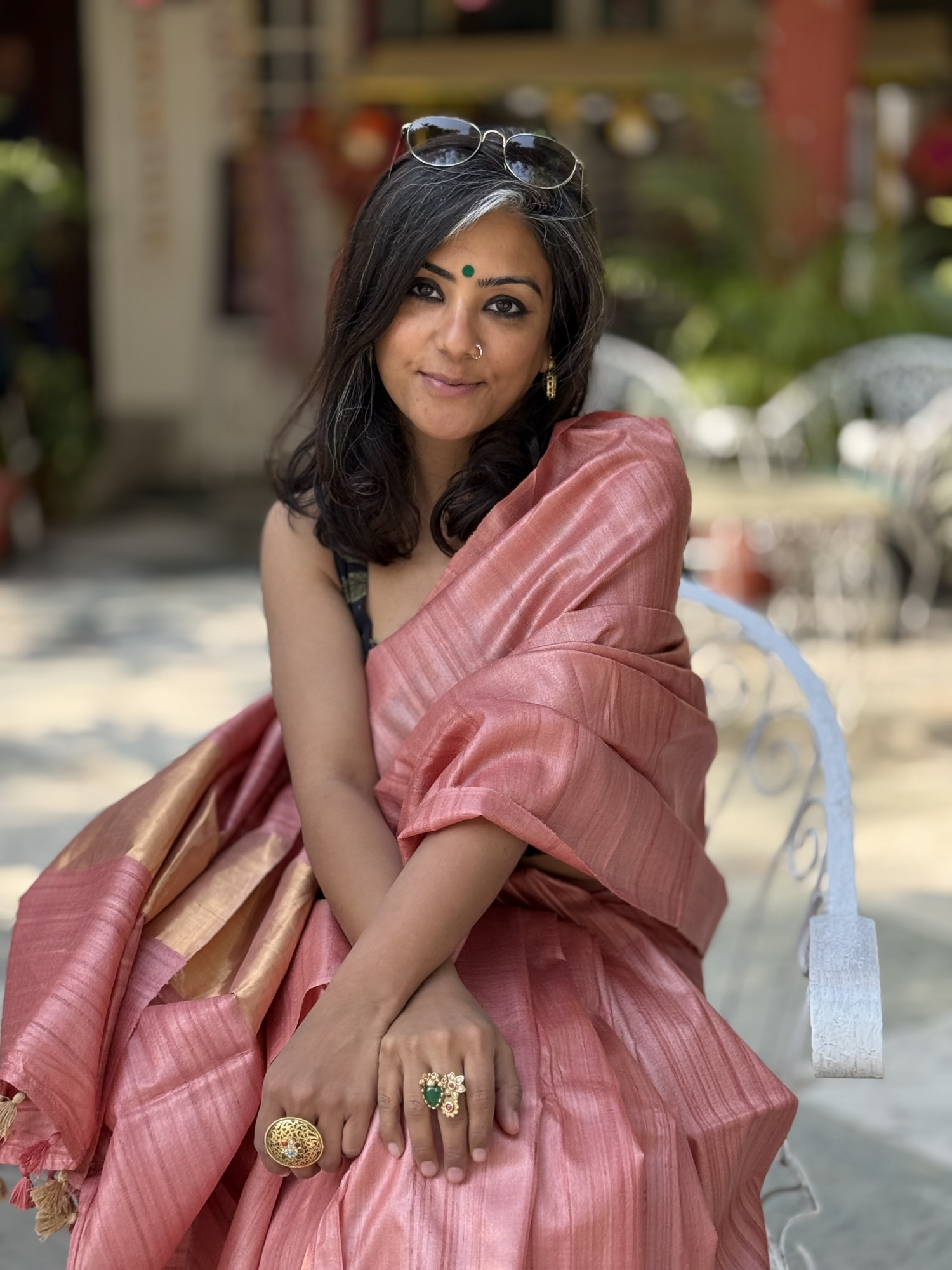 PEACH DESI TUSSAR WOVEN SILK sari with WITH DOUBLE ZARI patta WOVEN PALLA accessorised with tassles.