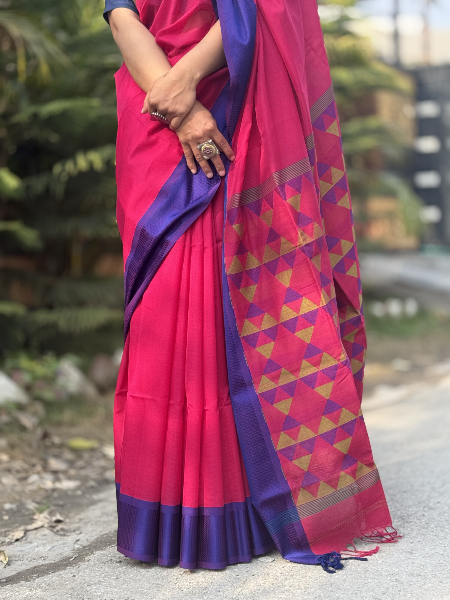 MAGENTA MAHESHWARI SILK AND COTTON SARI WITH GANGA-JAMUNA RESHAM BORDER AND JACQUARD WOVEN PALLA.