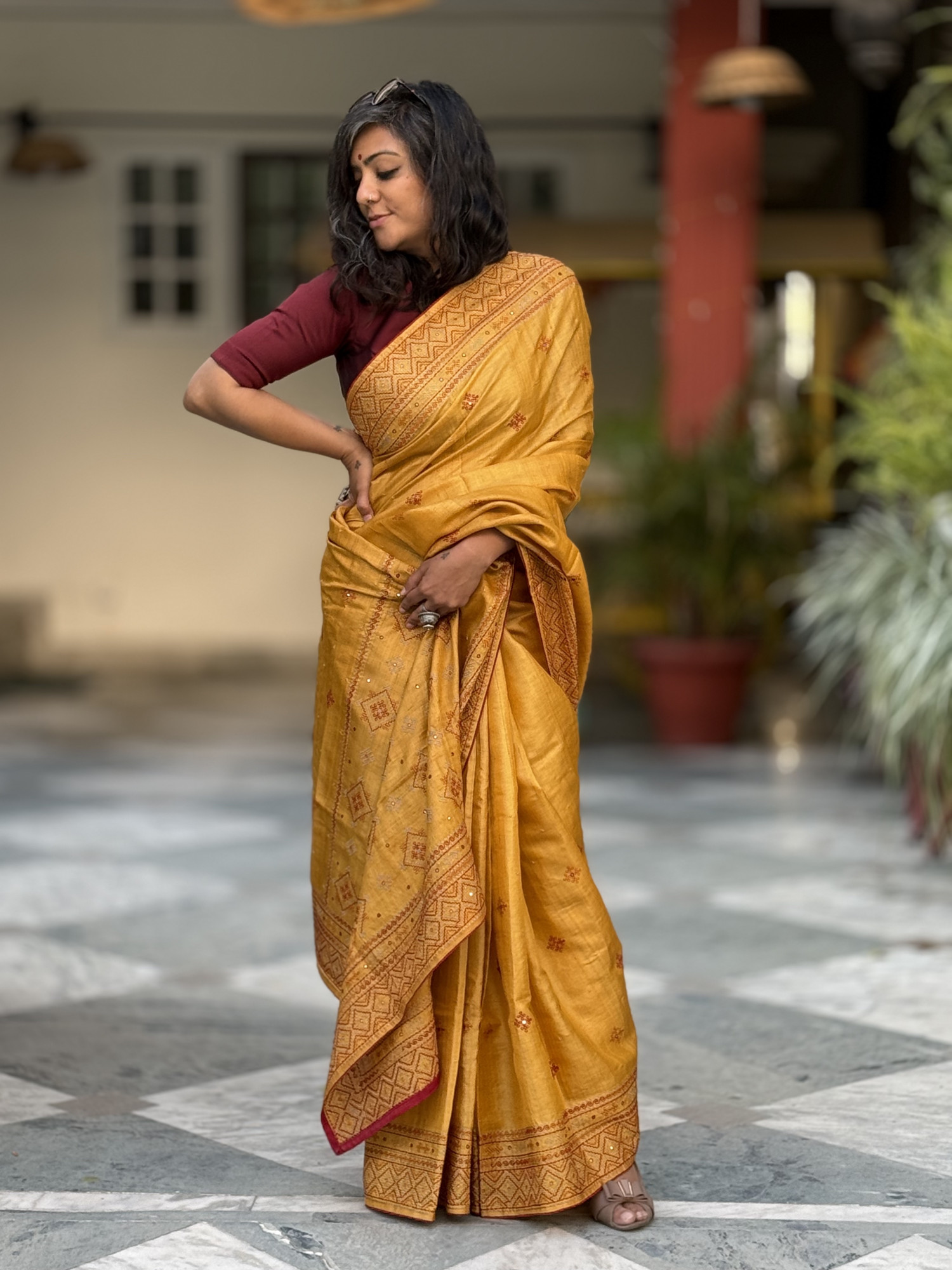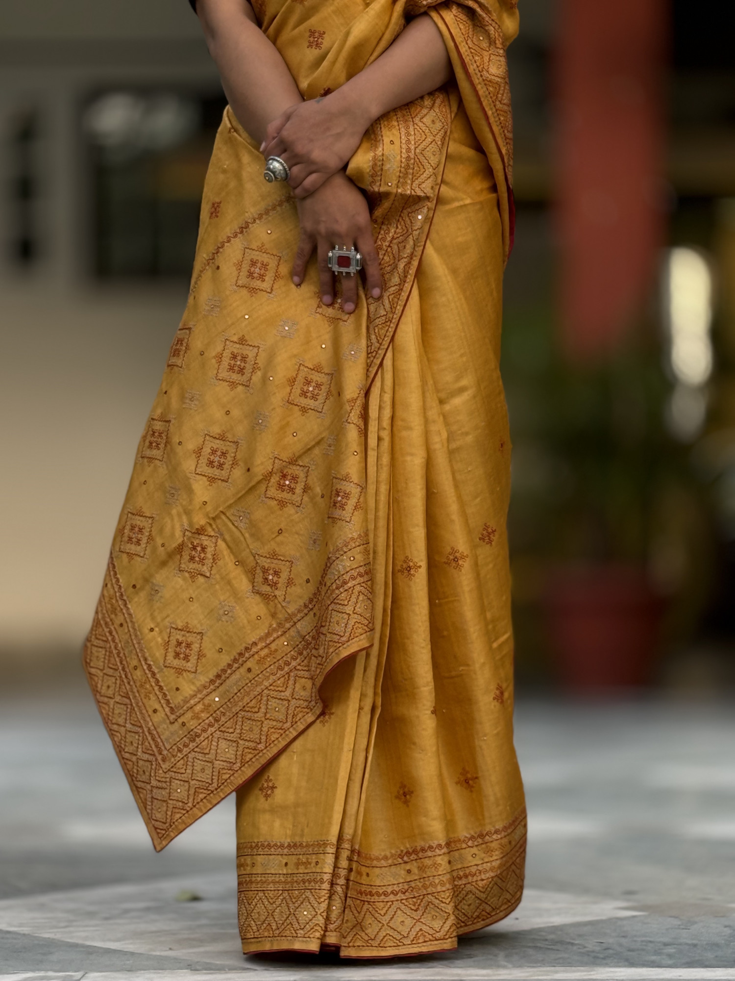 MUSTARD TUSSAR SILK SARI WITH MANUAL MACHINE EMBROIDERY WITH FAUX MIRROR ON THE BORDER AND PALLA AND SMALL BOOTAS ALL OVER, AND TAPING.