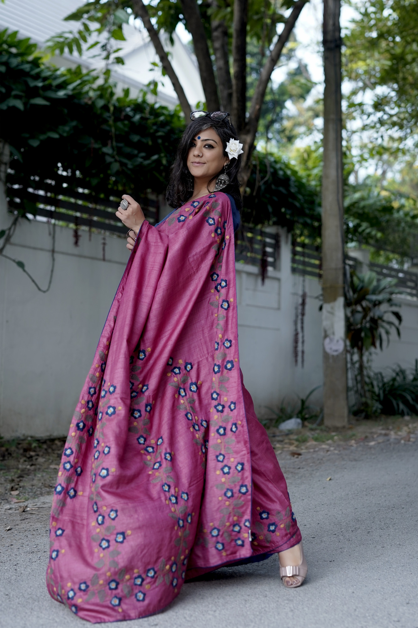 MAGENTA NATURAL DYED TUSSAR SILK SARI WITH HAND EMBROIDERY ALL OVER , ACCESSORISED WITH TAPINGS.
