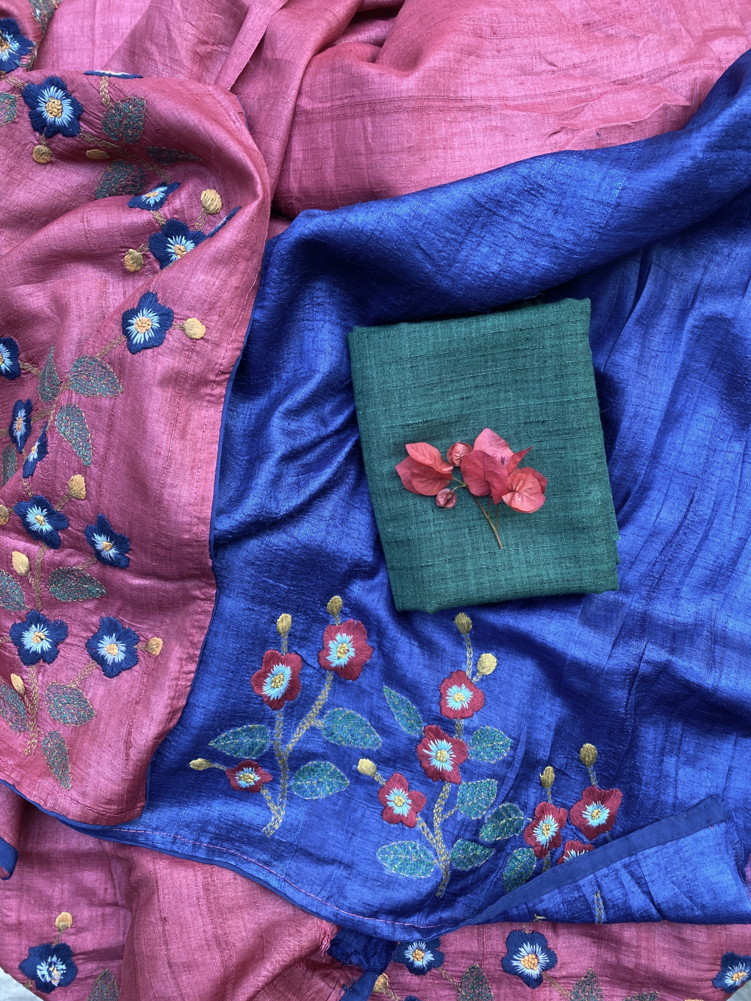 Comes with its own BLUE HEAVY EMBROIDERED SILK BLOUSE AND AN EXTRA GREEN COTTON TUSSAR BLOUSE PIECE ( 90 cm)