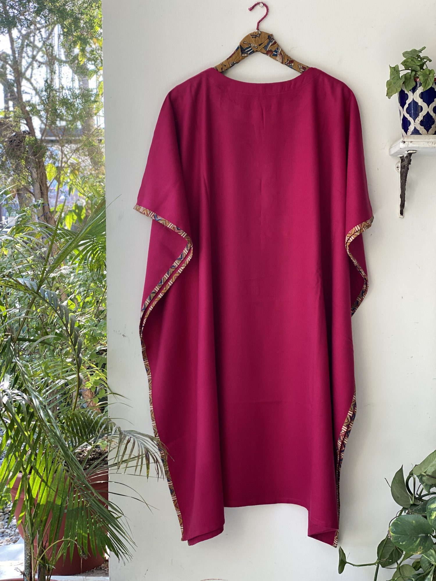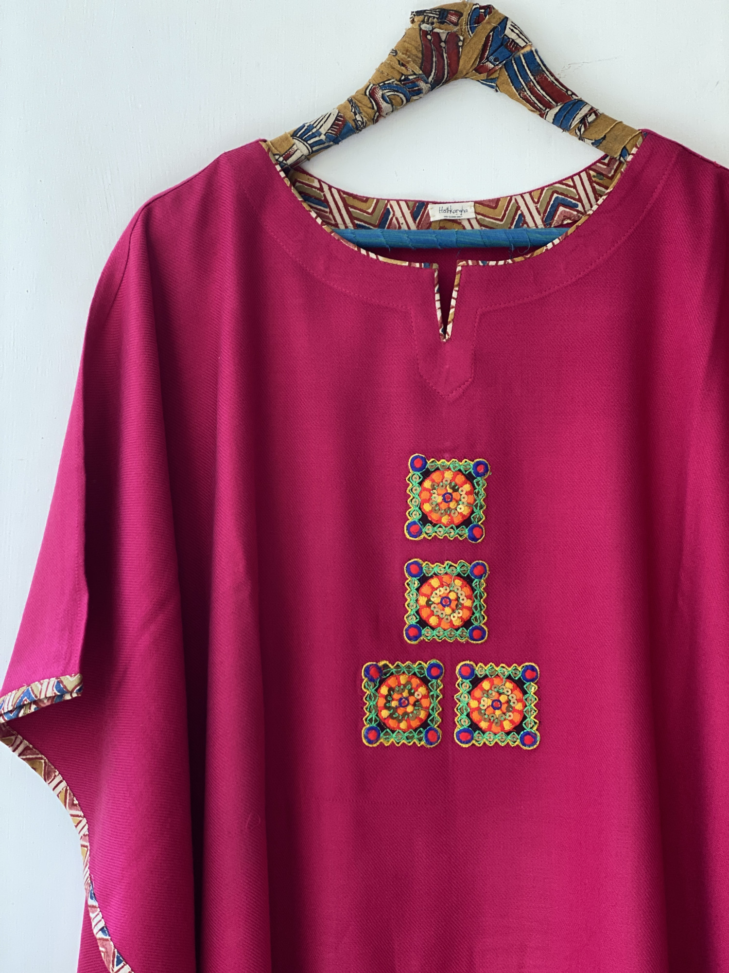 MAGENTA WOOLLEN KAFTAN, WITH PATCHWORK AND MANUAL MACHINE EMBROIDERY.