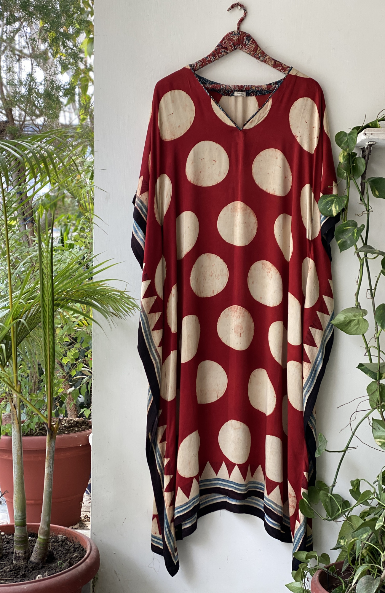MAROON AJRAKH HAND BLOCK PINTED MODAL SILK V-NECK KAFTAN .