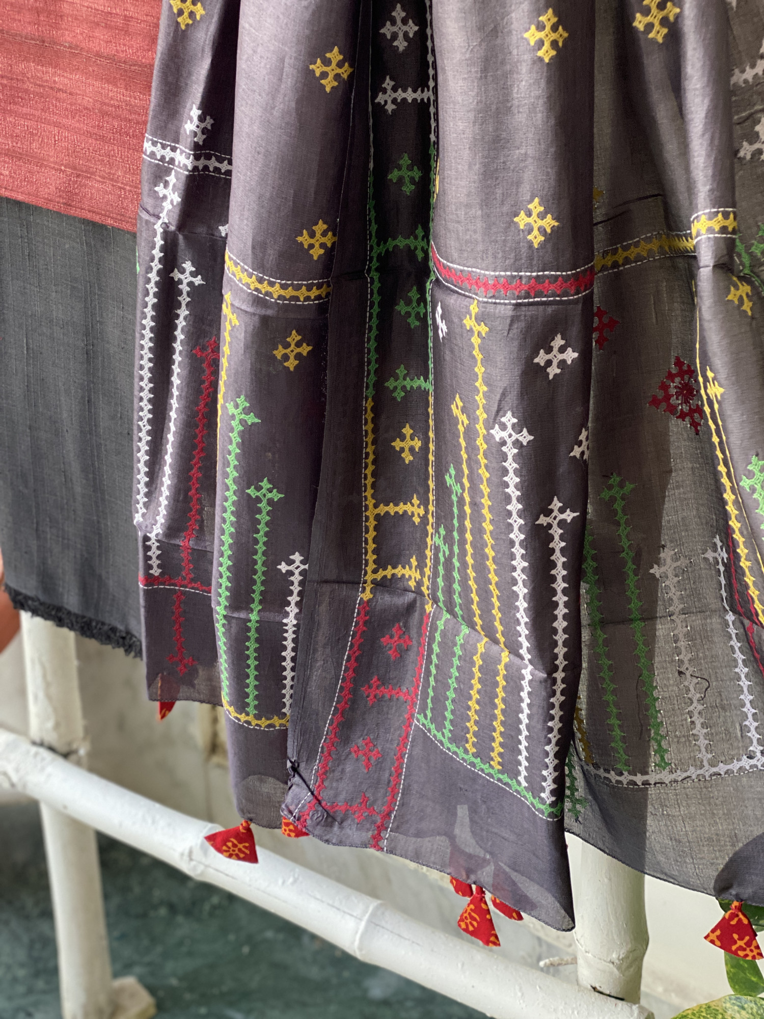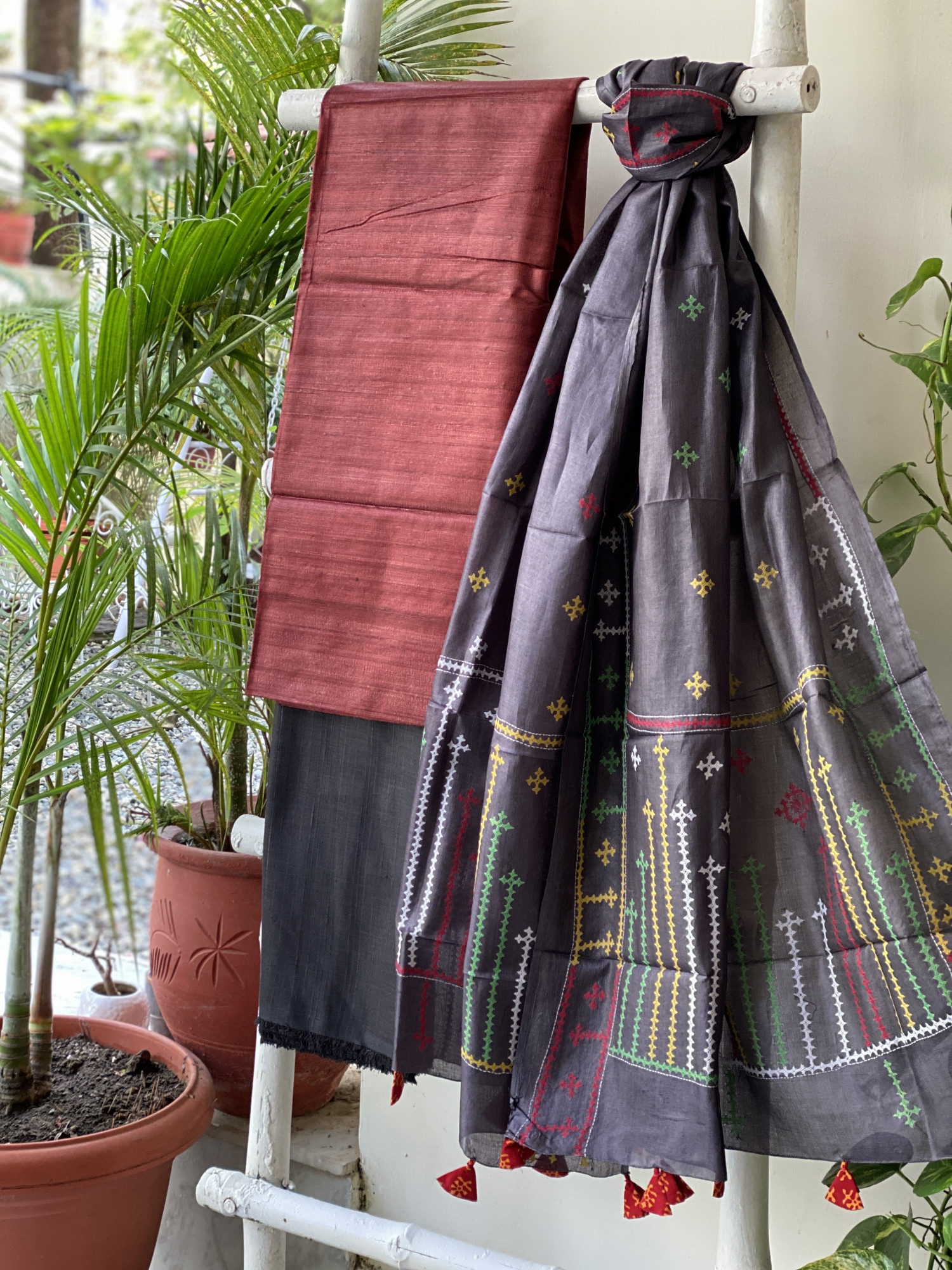 MAROON GICHA TUSSAR SILK Shirt AND COTTON TUSSAR BOTTOM paired with A BLACK SINDHI HAND EMBROIDERED SILK dupatta AND accessorised with tassles.