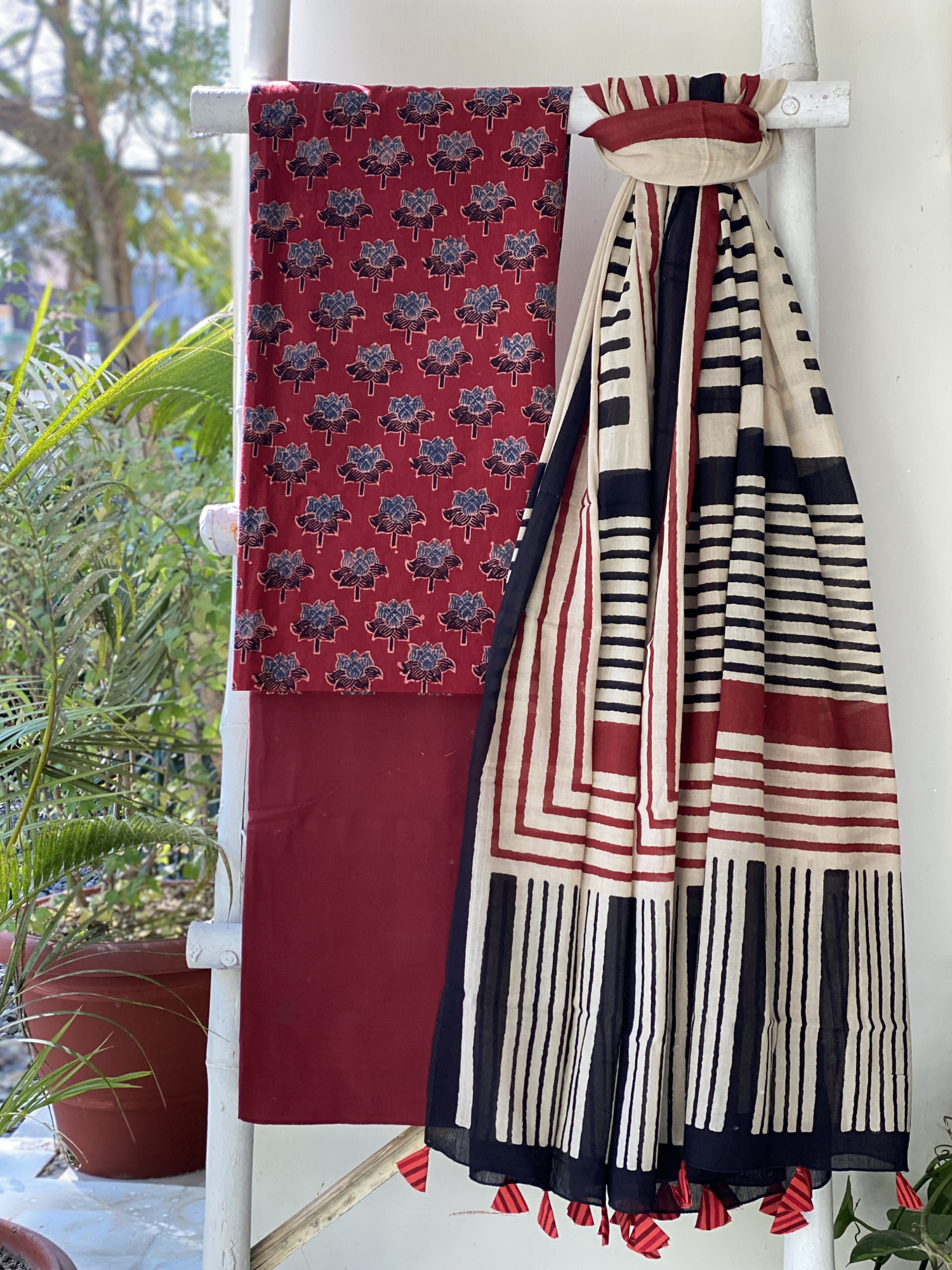 MAROON AJRAKH HAND BLOCK PRINT MUL COTTON SHIRT AND A PLAIN MAROON MUL COTTON BOTTOM, PAIRED WITH A BEIGE GEOMETRIC PATTERN MUL COTTON BLOCK PRINT DUPATTA,  ACCESSORISED WITH TASSLES.
