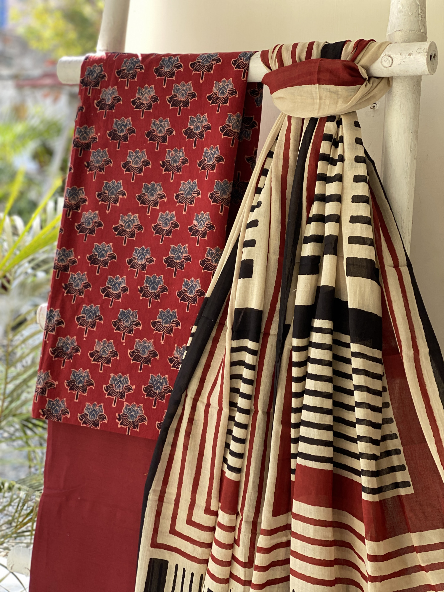 MAROON-BEIGE AJRAKH BLOCK PRINT MUL COTTON DUPATTA SET