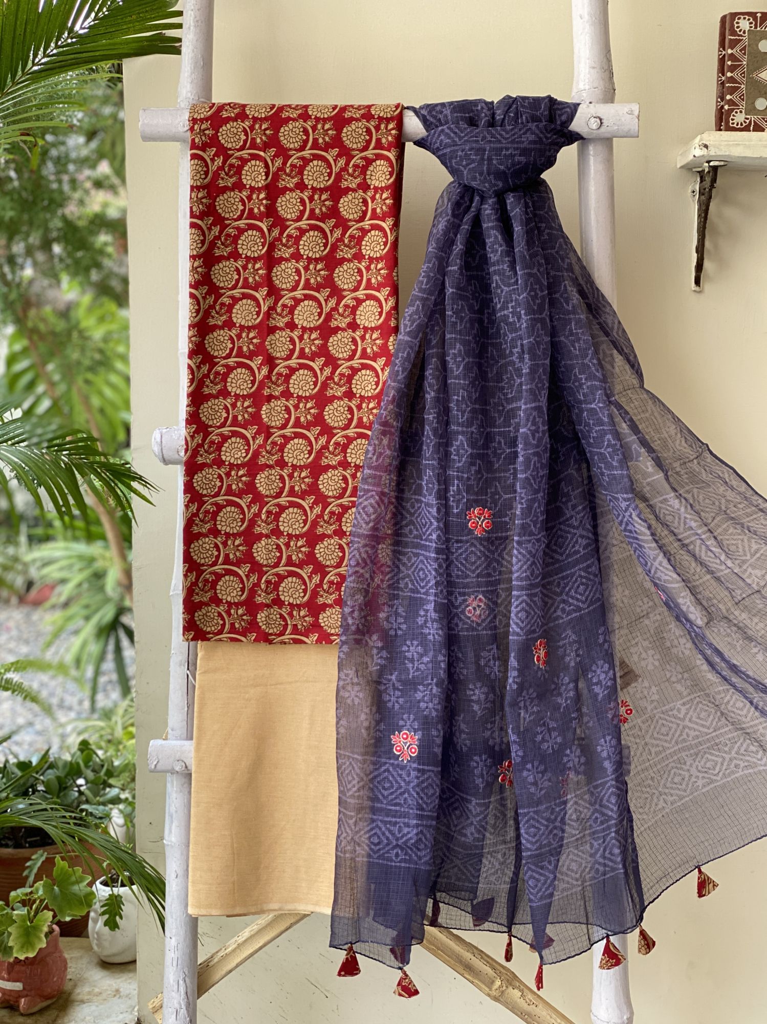 MAROON & BEIGE HANDBLOCK PRINT COTTON SHIRT & BEIGE WOVEN COTTON PLAIN BOTTOM, PAIRED WITH AN INK BLUE KOTA EMBROIDERED DUPATTA, ACCESSORISED WITH TASSLES.