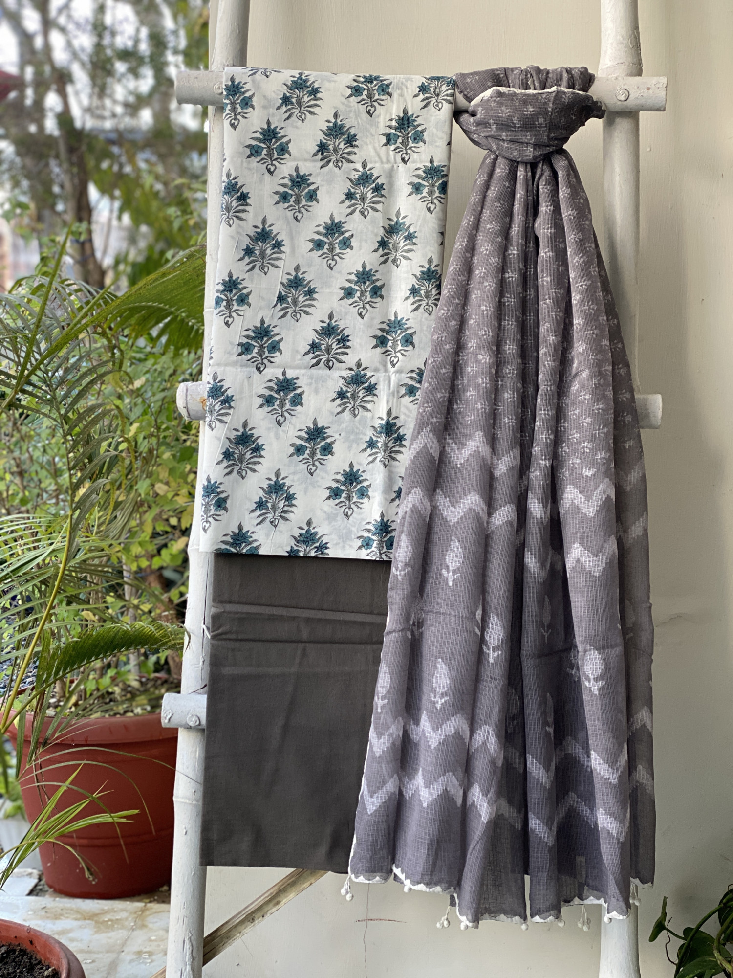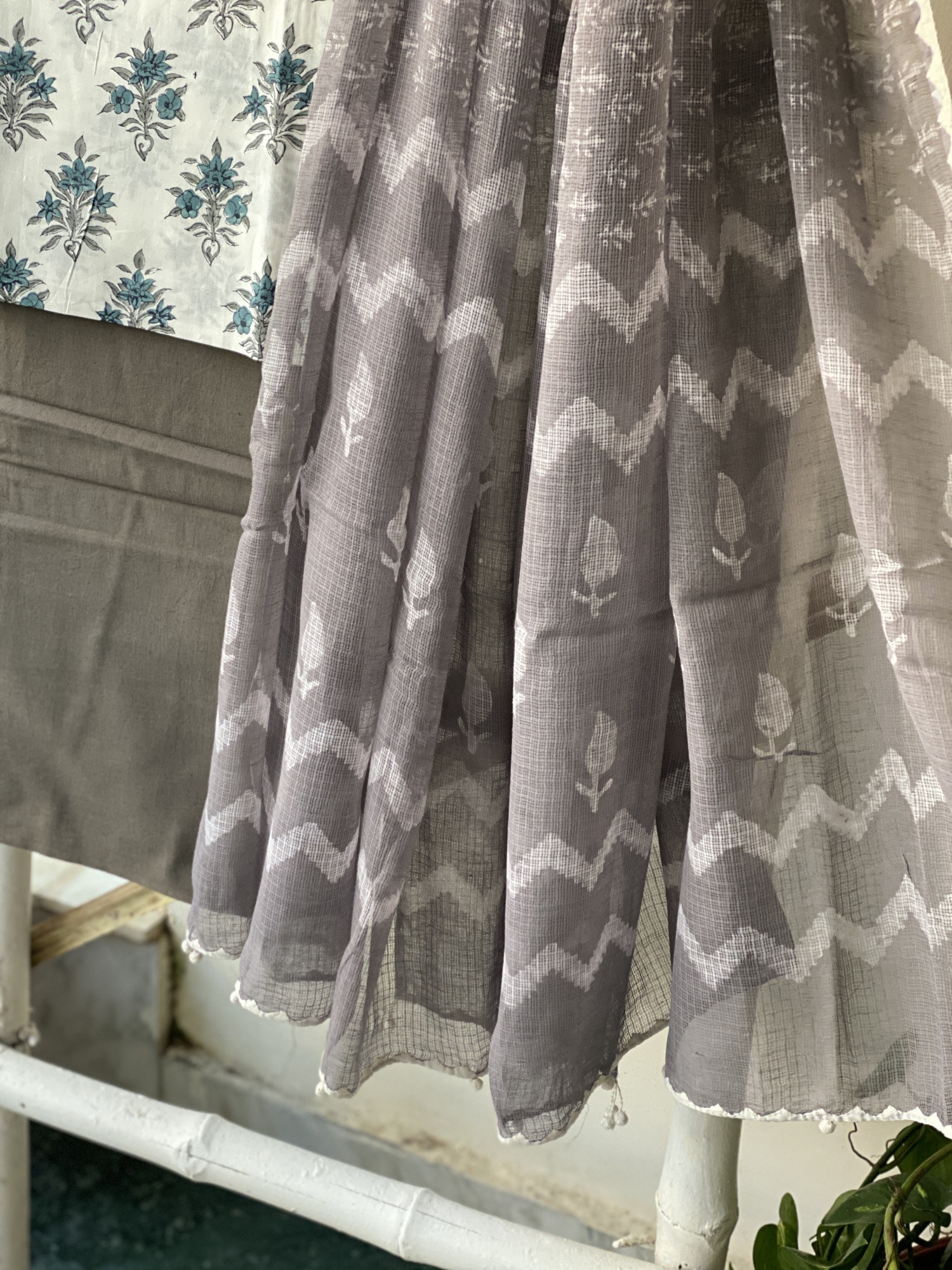 OFF WHITE HANDBLOCK PRINT COTTON SHIRT & GREY COTTON PLAIN BOTTOM, PAIRED WITH A GREY KOTA HAND BLOCK PRINTED DUPATTA WITH APPLIQUE BORDERS, ACCESSORISED WITH TASSLES.
