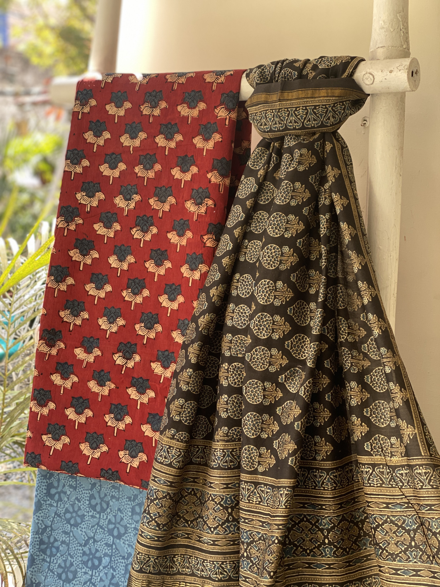 MAROON AJRAKH HAND BLOCK PRINT COTTON SHIRT AND AN INDIGO BLOCK PRINTED COTTON BOTTOM PAIRED WITH A BLACK AJRAKH HAND BLOCK PRINT CHANDERI SILK AND COTTON DUPATTA WITH ZARI BORDERS, ACCESSORISED WITH TASSLES.