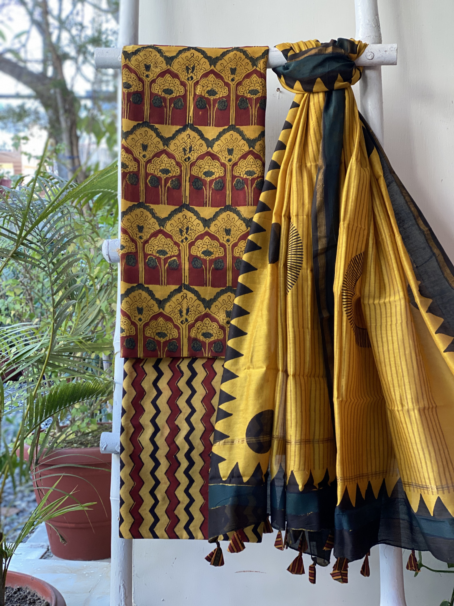 MUSTARD CHANDERI HAND BLOCK PRINTED SILK & COTTON ZARI WOVEN BORDER SHIRT WITH A MUSTARD HAND BLOCK PRINTED COTTON MULL BOTTOM PAIRED WITH A MUSTARD HAND BLOCK PRINT CHANDERI ZARI WOVEN BORDER DUPATTA, ACCESSORISED WITH TASSLES.