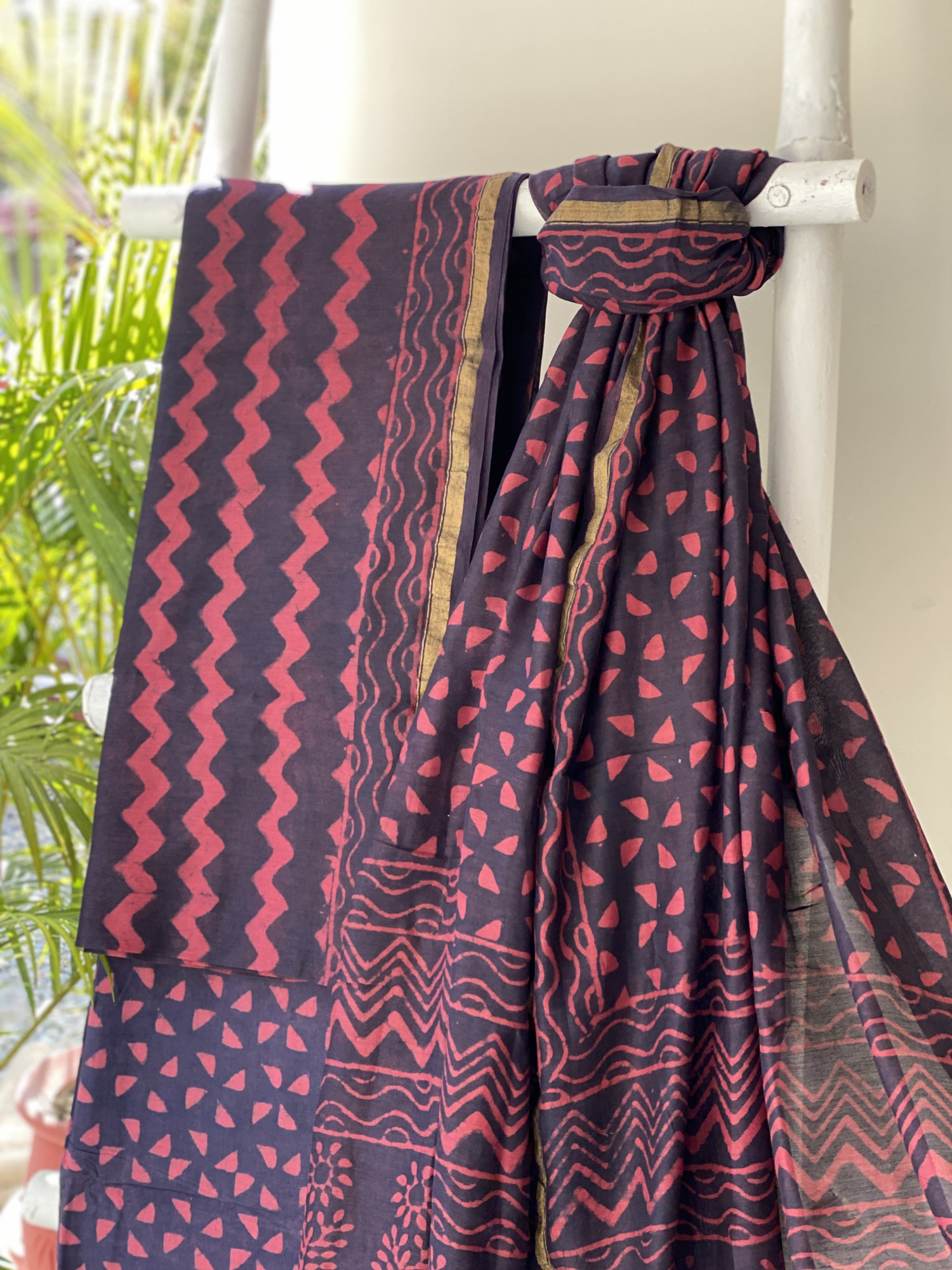 MAROON-BLACK CHANDERI HAND BLOCK PRINTED SILK & COTTON ZARI WOVEN BORDER SHIRT WITH A MAROON-BLACK HAND BLOCK PRINT COTTON MULL BOTTOM PAIRED WITH A MAROON-BLACK HAND BLOCK PRINT CHANDERI ZARI WOVEN BORDER DUPATTA, ACCESSORISED WITH TASSLES.