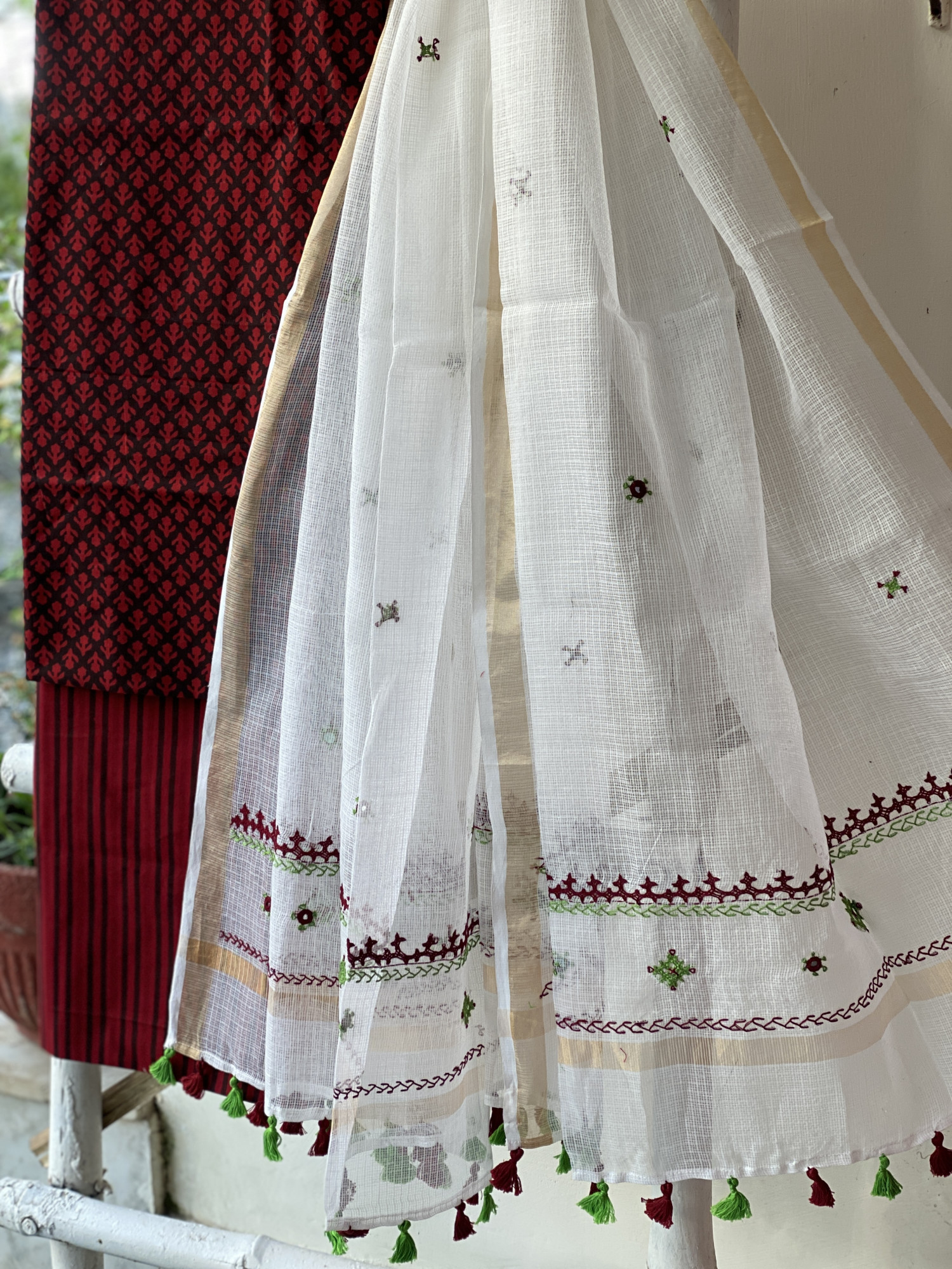 MAROON-BLACK HAND BLOCK PRINT COTTON SHIRT AND A MAROON-BLACK STRIPED BLOCK PRINTED COTTON BOTTOM PAIRED WITH AN OFF WHITE KOTA HAND EMBROIDERED DUPATTA WITH ZARI WOVEN BORDER, ACCESSORISED WITH TASSLES.