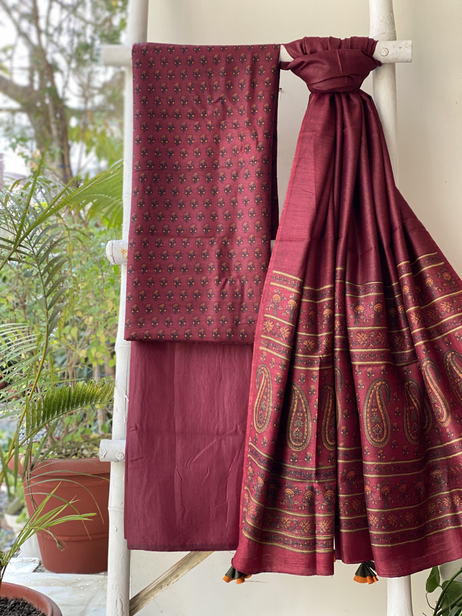 MAROON HANDBLOCK PRINT PASHMINA WOVEN SILK SHIRT WITH PLAIN WOVEN BOTTOM PAIRED WITH A MAROON BLOCK PRINT PASHMINA SILK WOVEN DUPATTA . ACCESORISED WITH TASSELS.