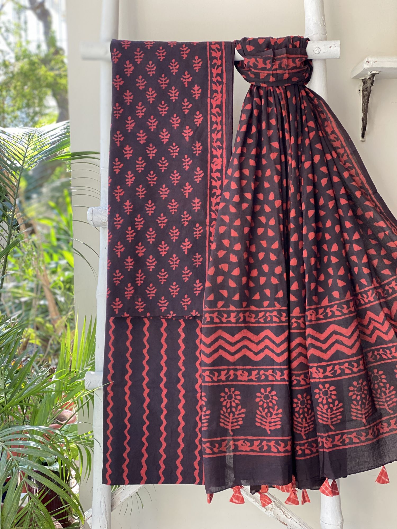 MAROON-BROWN HAND BLOCK PRINT MUL COTTON DUPATTA SET