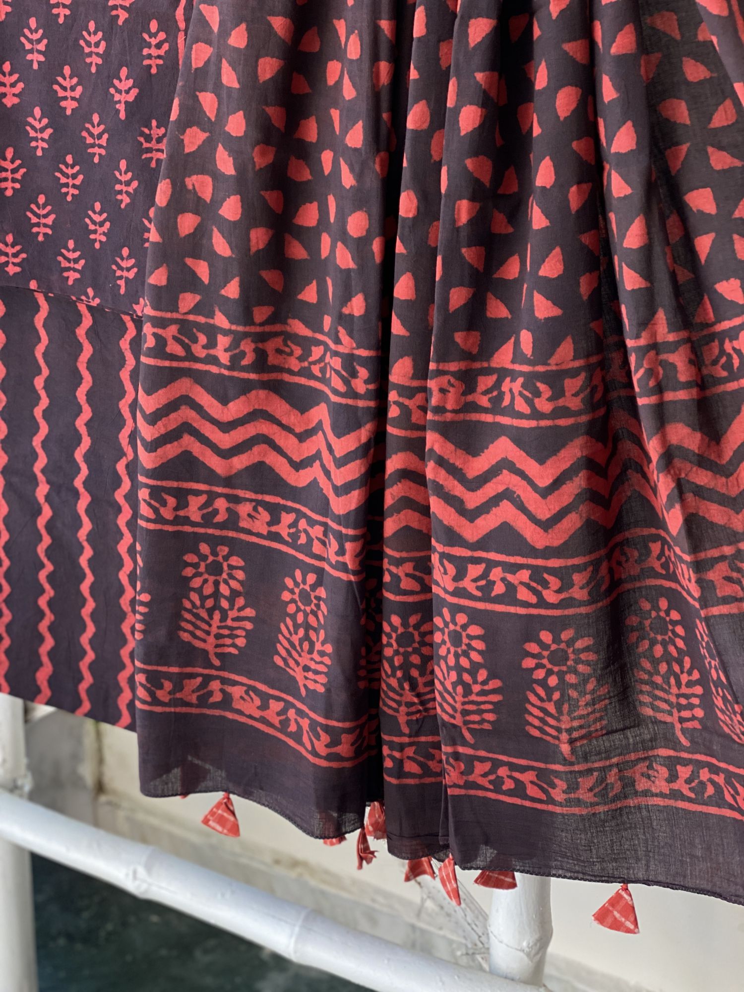 MAROON-BROWN HAND BLOCK DABU PRINT MUL COTTON SHIRT AND BOTTOM, PAIRED WITH A MAROON-BROWN MUL COTTON HAND BLOCK PRINT DUPATTA,  ACCESSORISED WITH TASSLES.