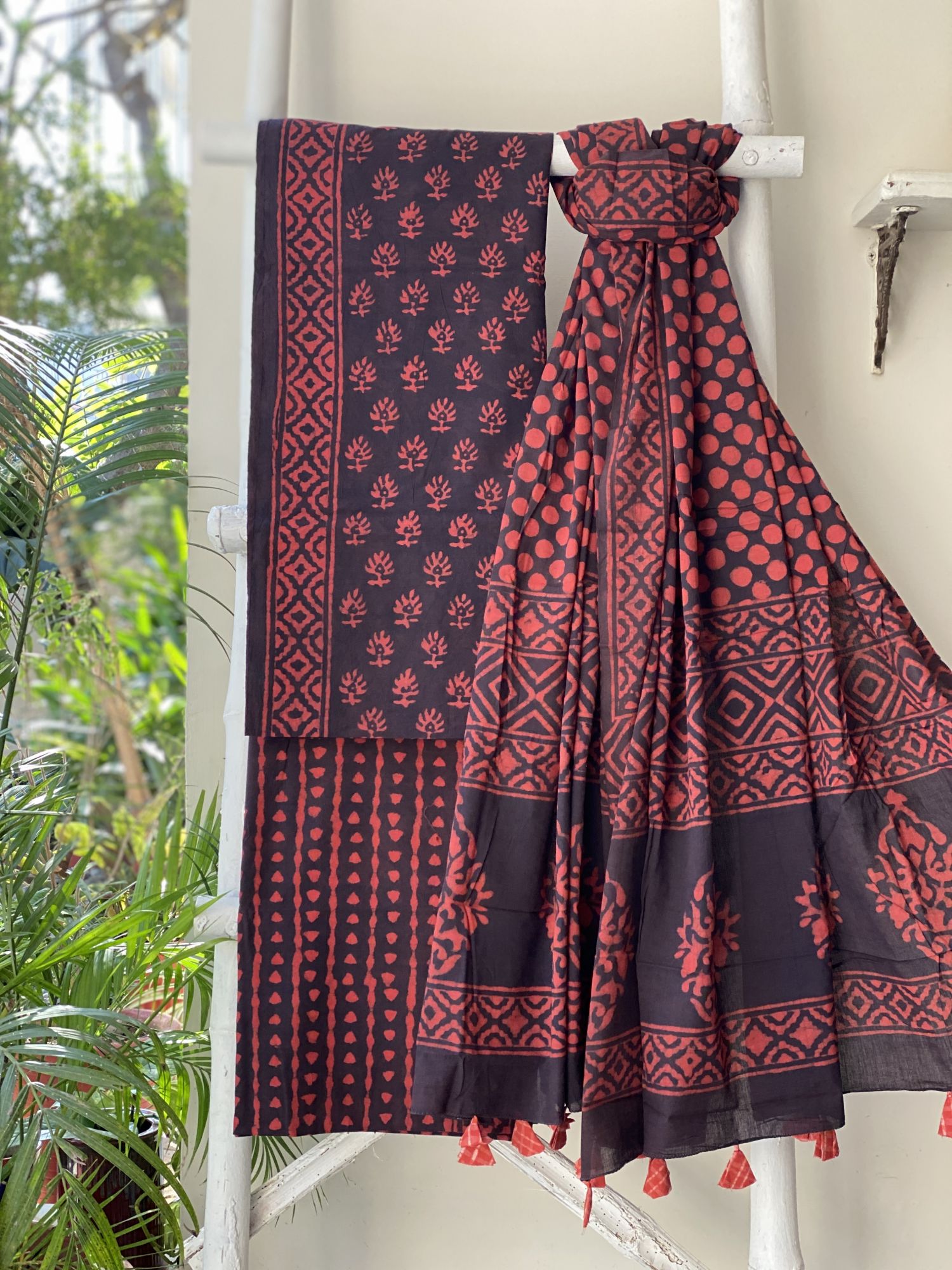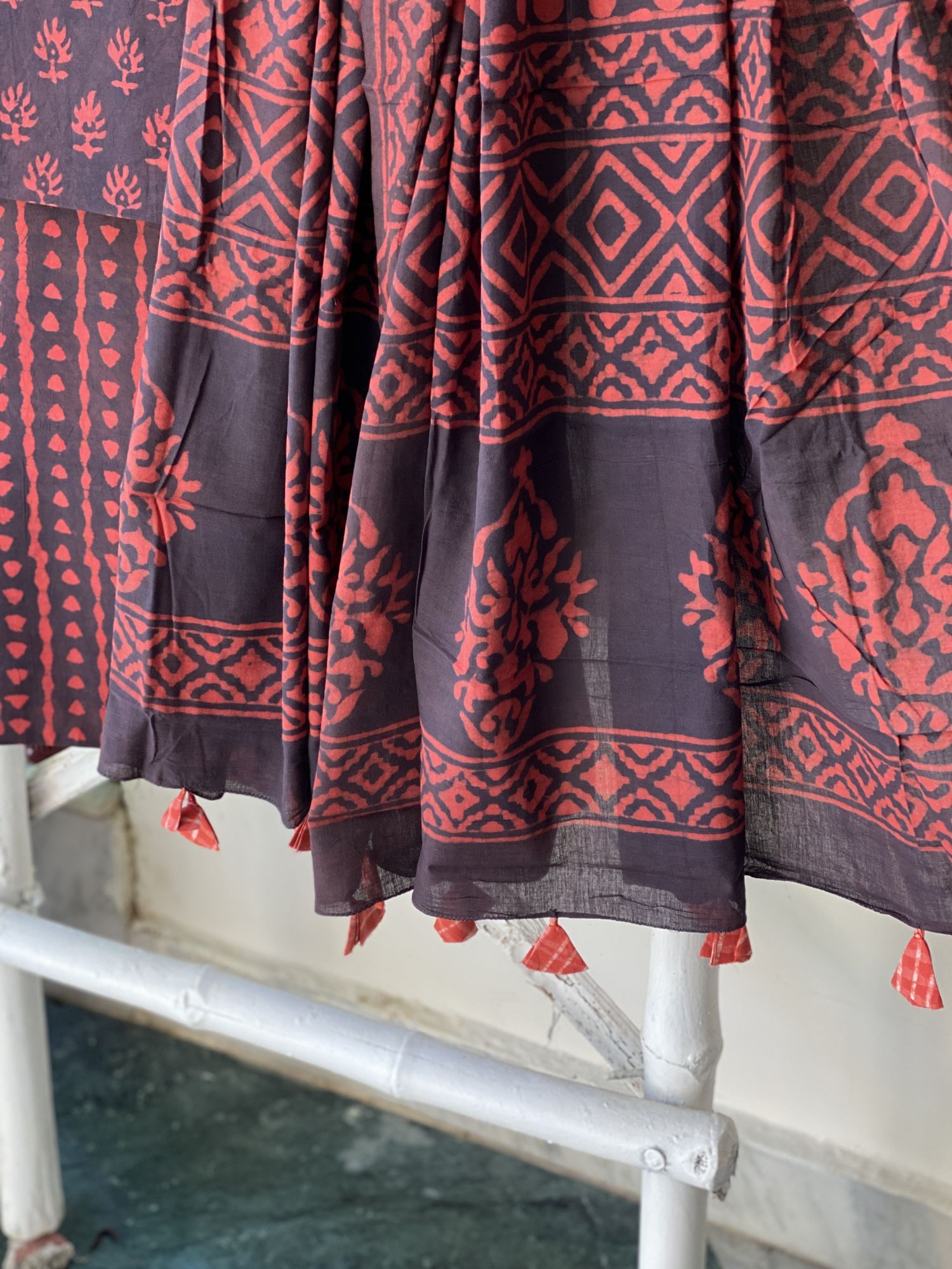 MAROON-BROWN HAND BLOCK DABU PRINT MUL COTTON SHIRT AND BOTTOM, PAIRED WITH A MAROON-BROWN MUL COTTON HAND BLOCK PRINT DUPATTA, ACCESSORISED WITH TASSLES.