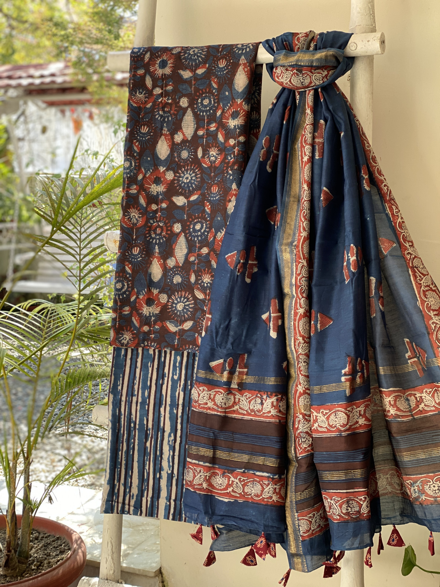 MAROON-INDIGO CHANDERI HAND BLOCK PRINTED SILK & COTTON ZARI WOVEN BORDER SHIRT WITH AN INDIGO HAND BLOCK PRINTED COTTON MULL BOTTOM PAIRED WITH AN INDIGO HAND BLOCK PRINT CHANDERI ZARI WOVEN BORDER DUPATTA, ACCESSORISED WITH TASSLES.