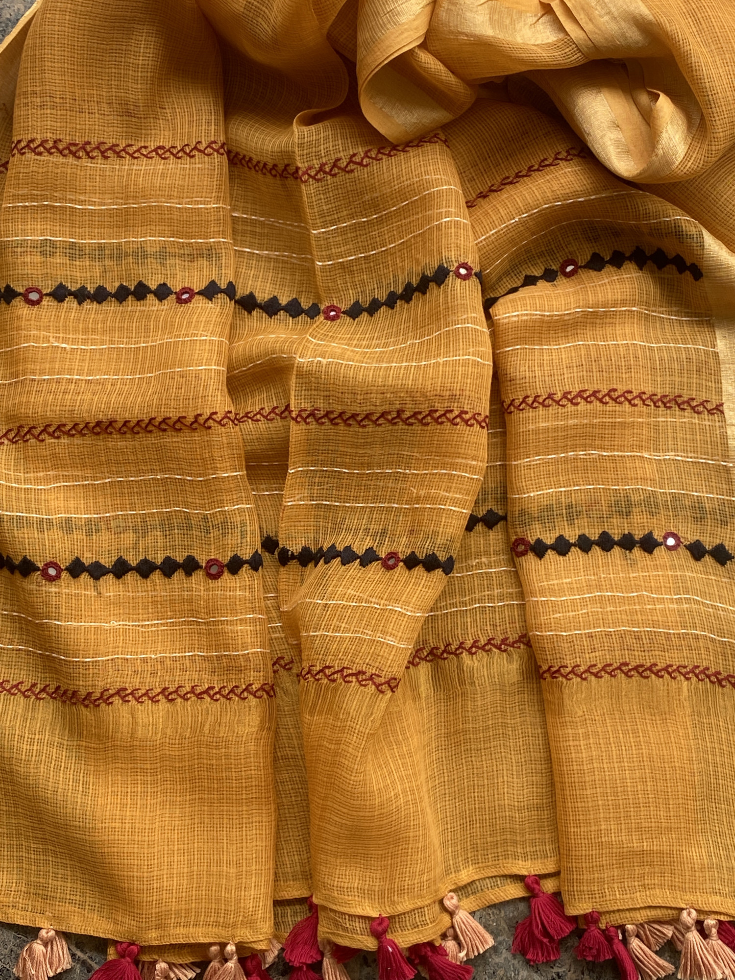 MAROON HAND BLOCK PRINT COTTON SHIRT AND A BLACK PLAIN COTTON BOTTOM PAIRED WITH A MUSTARD KOTA HAND EMBROIDERED DUPATTA WITH ZARI WOVEN BORDER, ACCESSORISED WITH TASSLES.