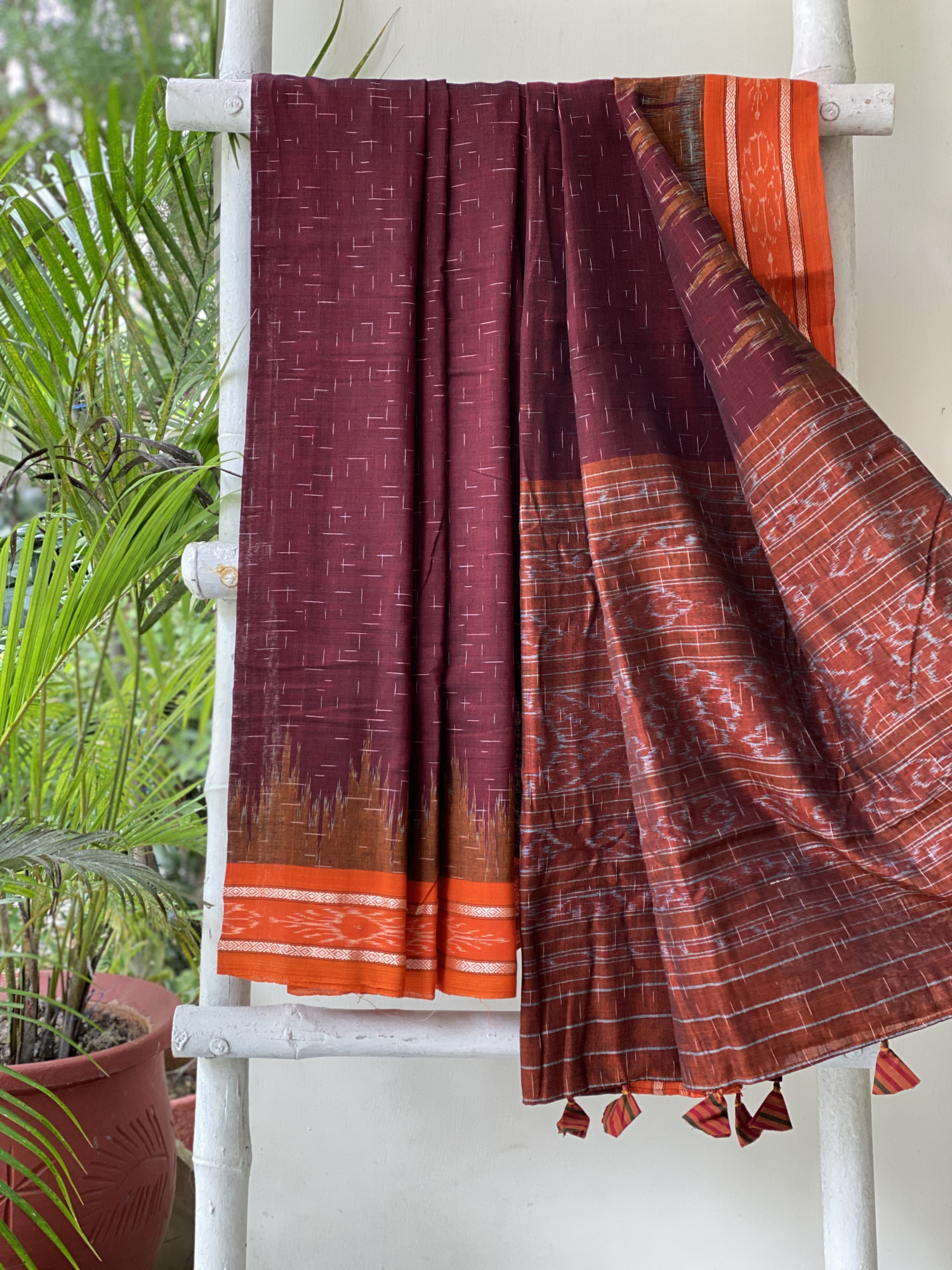 MAROON-ORANGE cotton 'JHARNA ' IKKAT woven sari accessorized with tassels.
