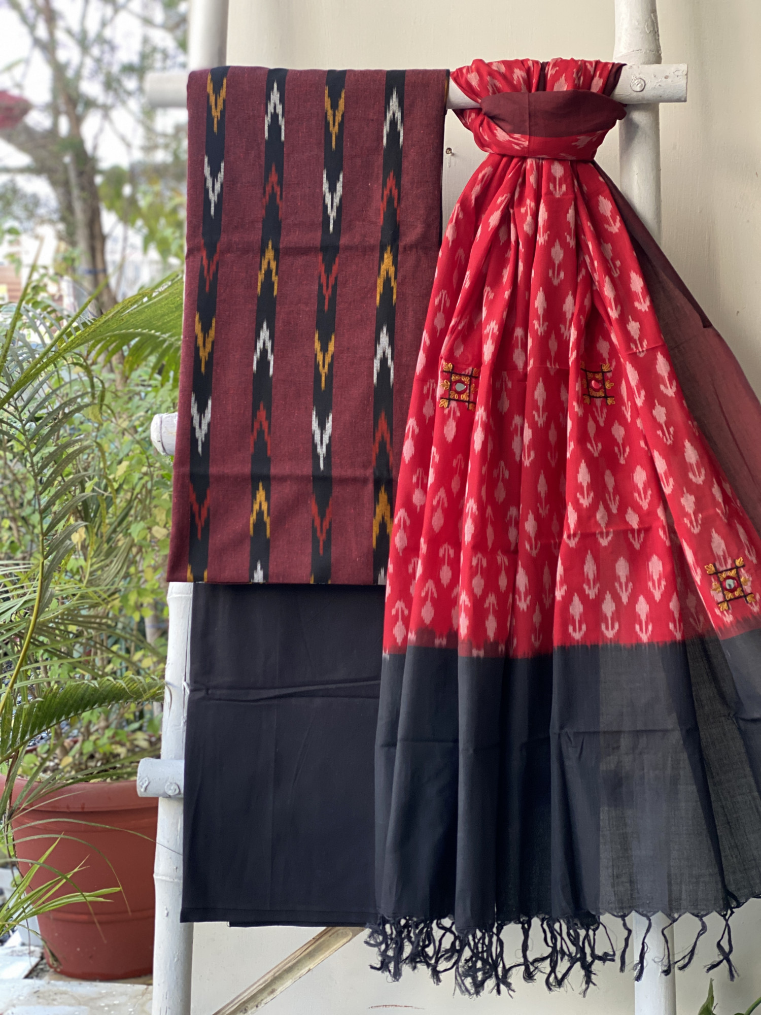 MAROON IKKAT WOVEN COTTON SHIRT WITH BLACK COTTON BOTTOM paired with a RED-BLACK MERCERISED COTTON WOVEN IKKAT EMBROIDERED dupatta