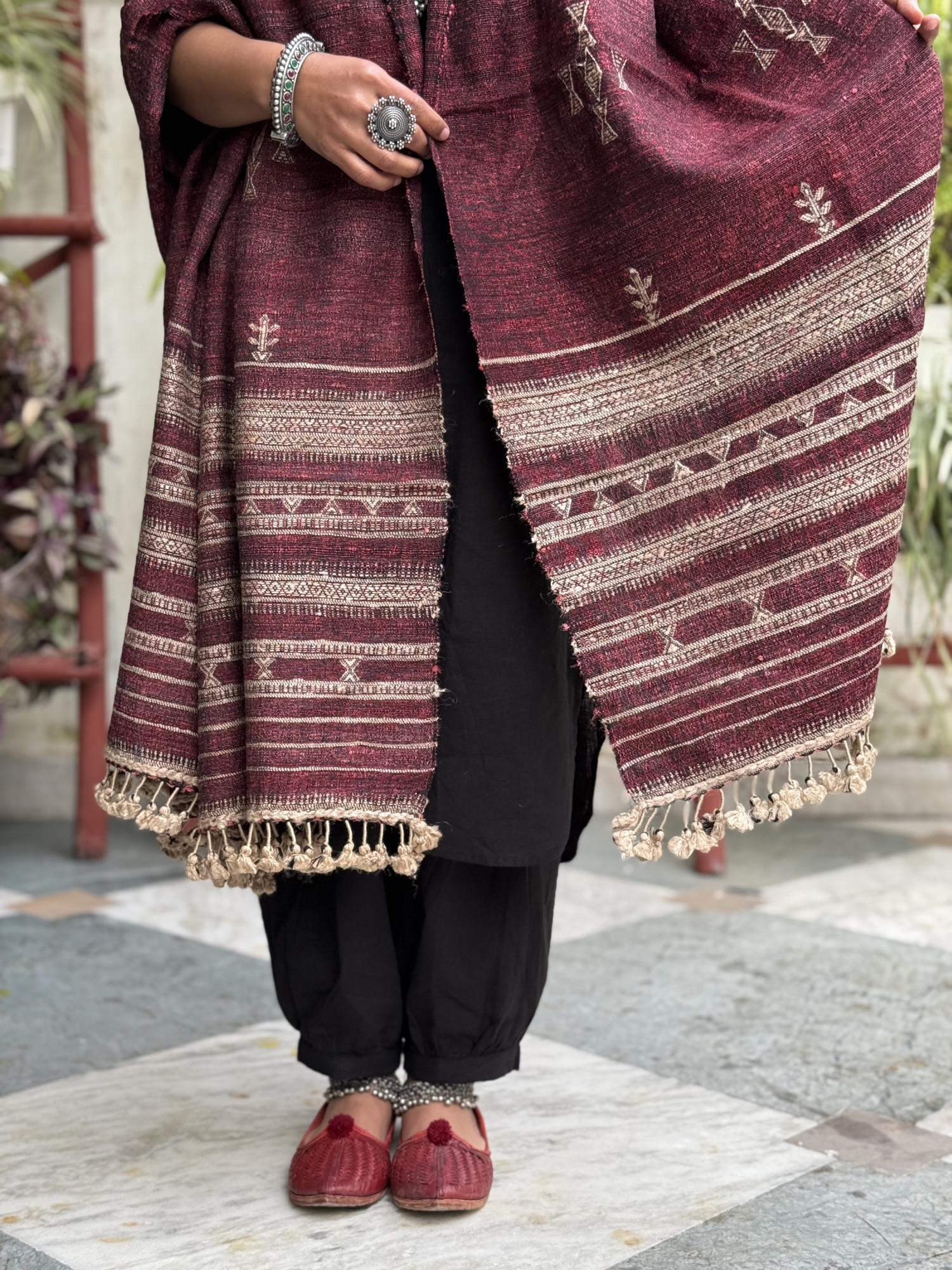 MAROON natural dyed SILK AND wool hand woven shawl WITH WOVEN BORDERS, ACCESSORISED WITH TASSELS