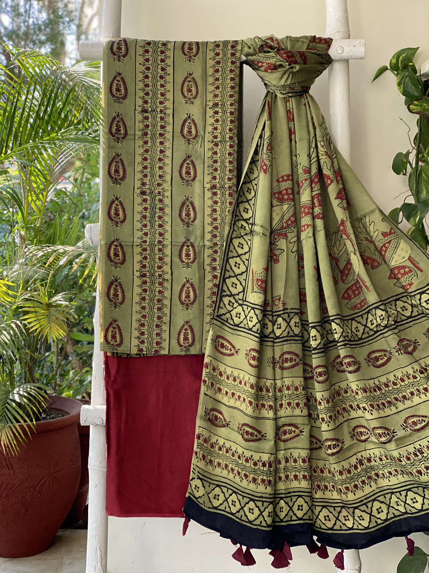 MEHNDI GREEN hand dyed ajrakh block print modal silk shirt and RED MODAL SILK PLAIN BOTTOM paired with A MEHNDI GREEN modal silk ajrakh block print dupatta, accessorised with tassles.