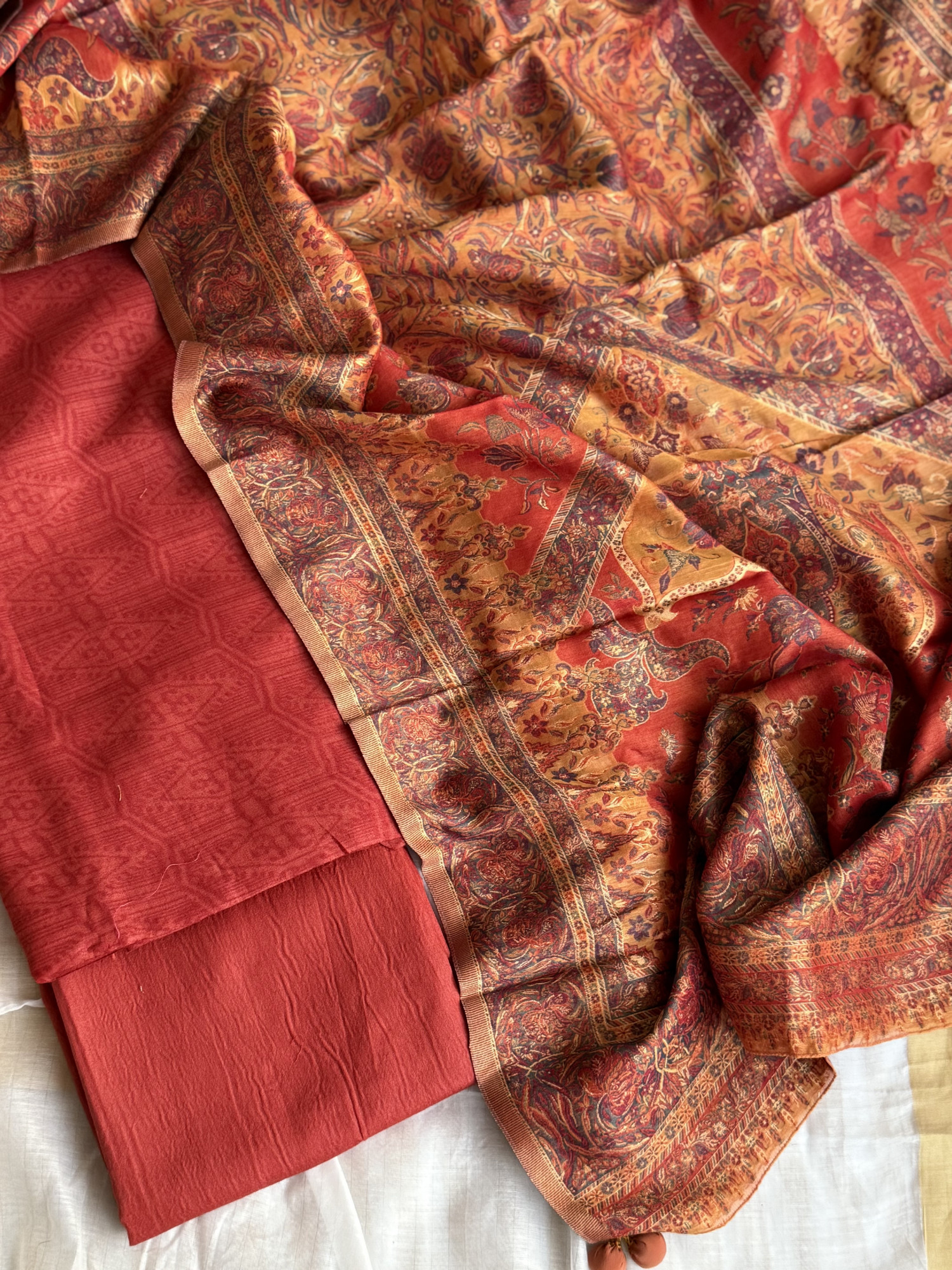 RED PRINTED WOVEN SILK SHIRT AND PLAIN RED WOVEN SILK BOTTOM PAIRED WITH A RED-MUSTARD WOVEN SILK DUPATTA WITH KANI WEAVE. ACCESSORISED WITH TASSELS.