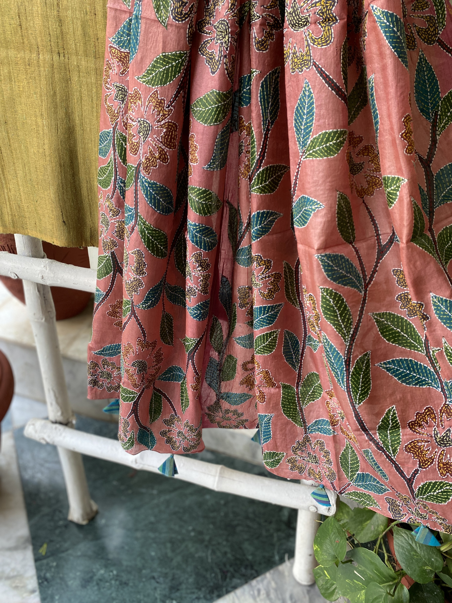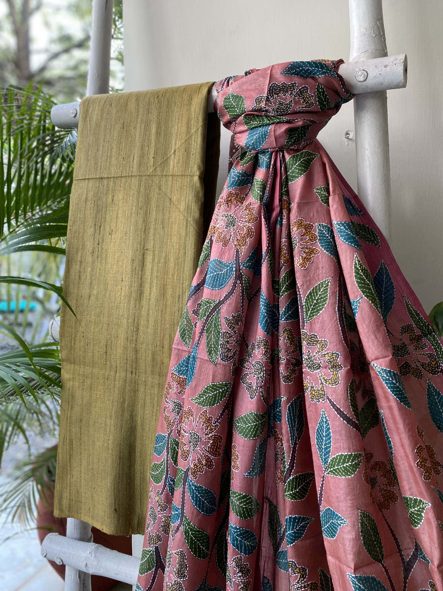 MEHNDI GREEN TUSSAR shirt AND BOTTOM paired with A SALMON KANTHA HAND EMBROIDERED SILK dupatta AND accessorised with tassles.