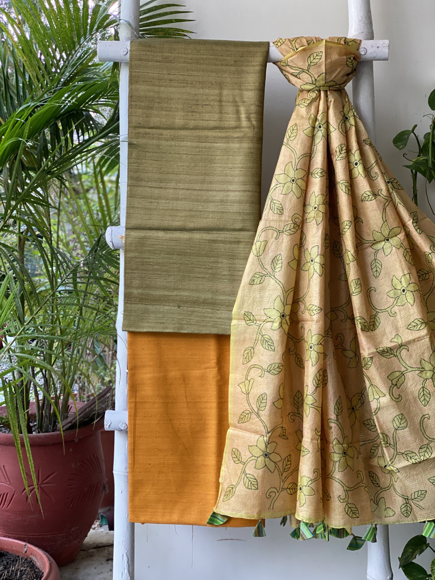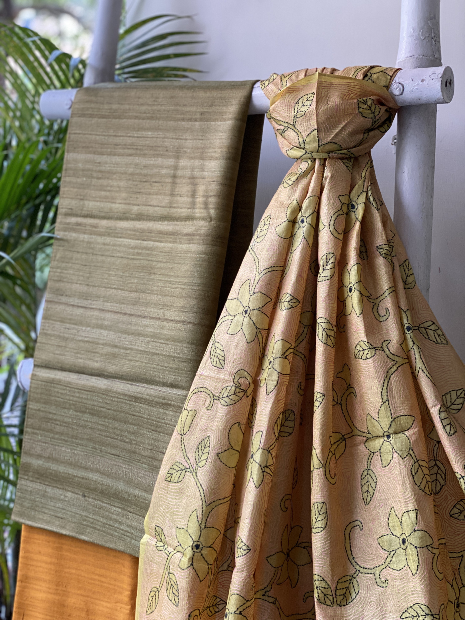 MEHNDI GREEN TUSSAR SILK shirt AND MUSTURD COTTON TUSSAR BOTTOM paired with A YELLOW KANTHA HAND EMBROIDERED SILK dupatta AND accessorised with tassles.