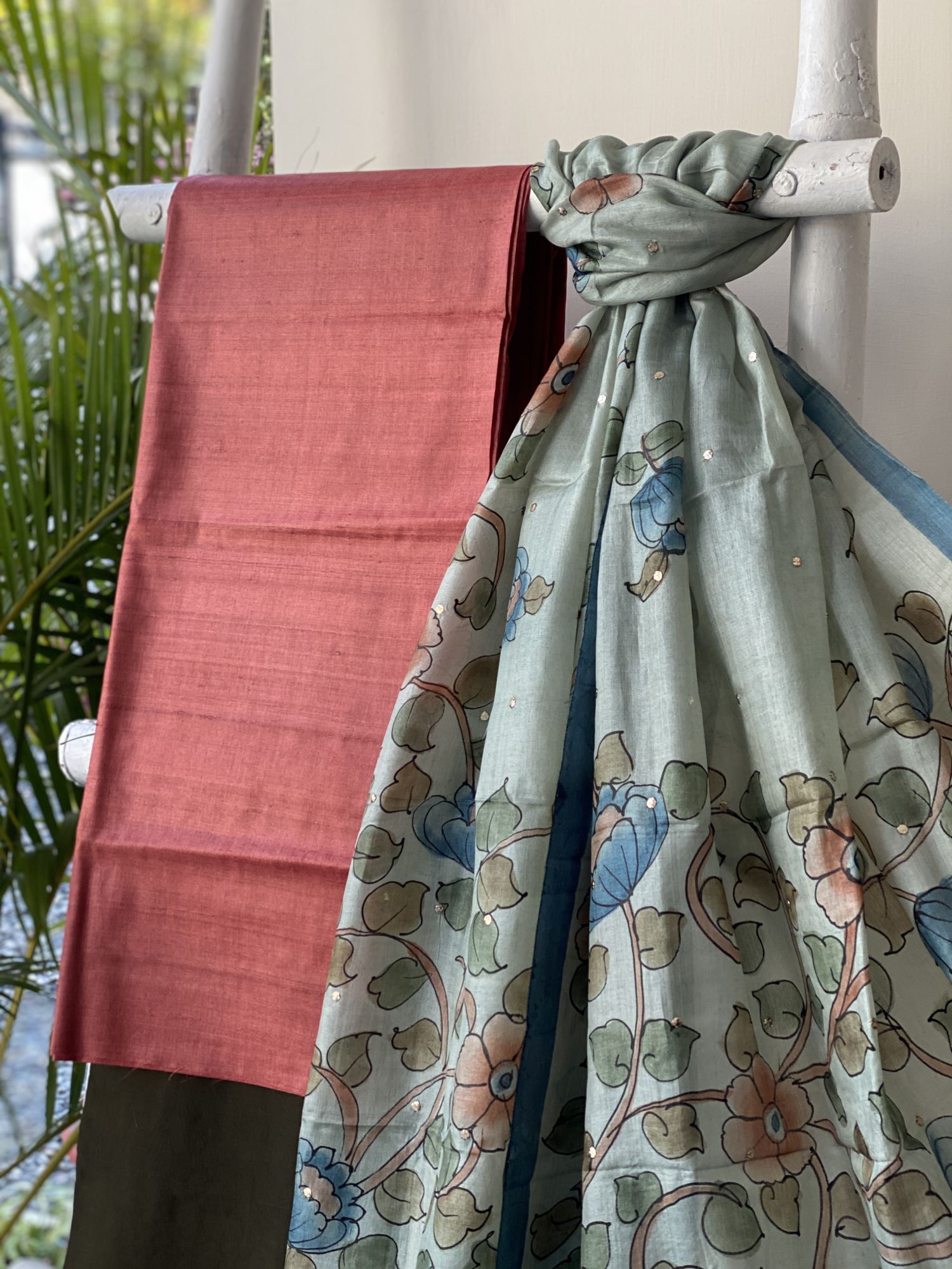 RUST TUSSAR SILK SHIRT AND MOSS GREEN MODAL SILK BOTTOM PAIRED WITH ICE BLUE HAND PAINTED TUSSAR SILK DUPATTA WITH GICHA SILK BORDER AND EMBELLISHED WITH MUQQAISH, ACCESSORISED WITH TASSELS.