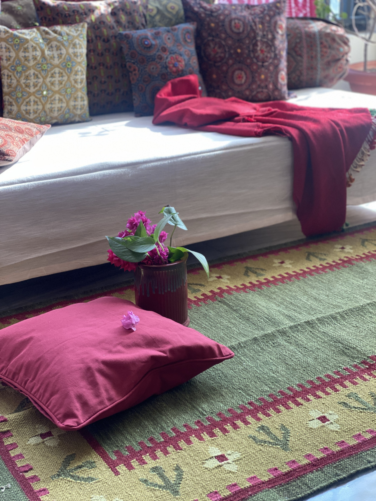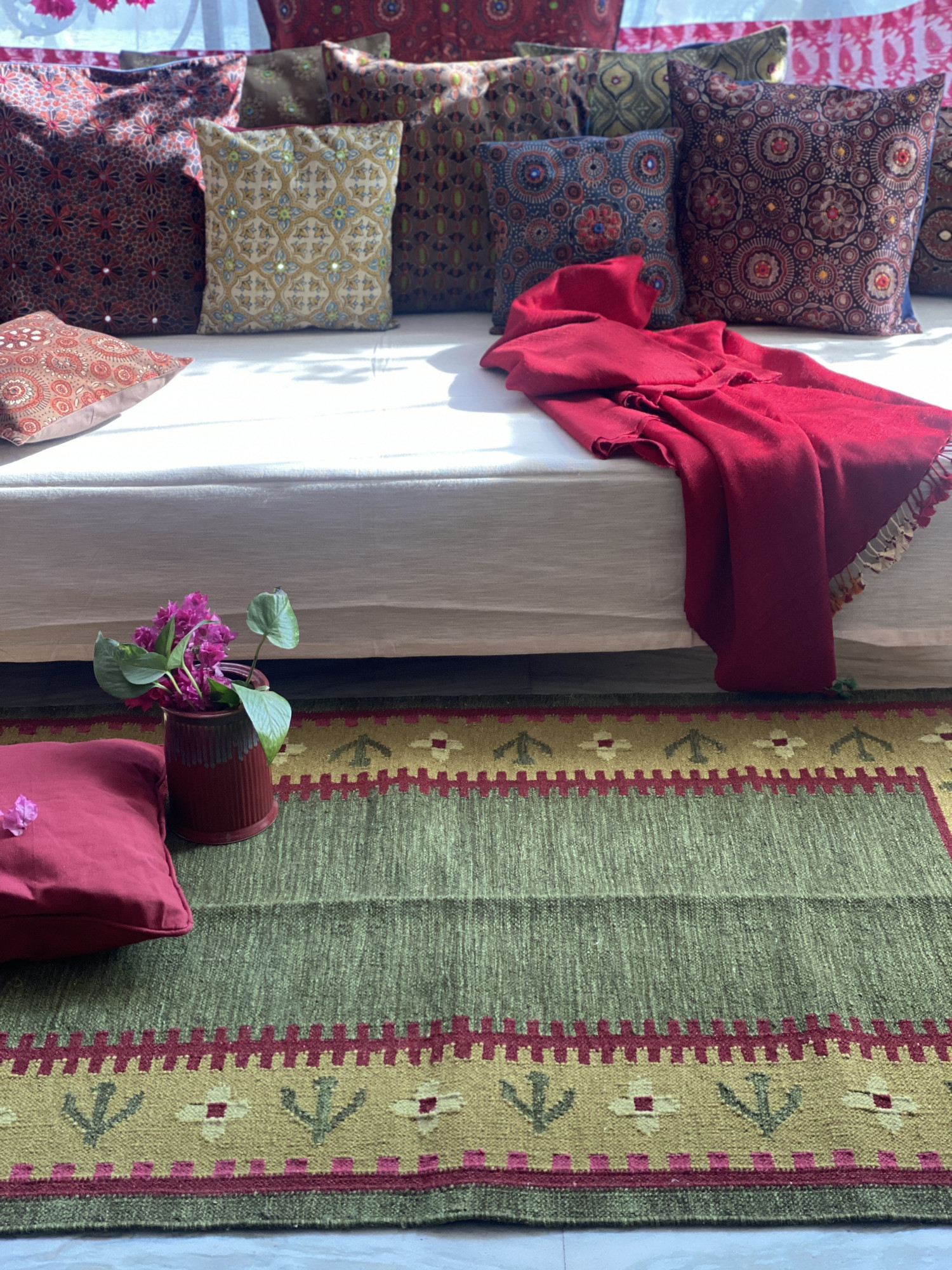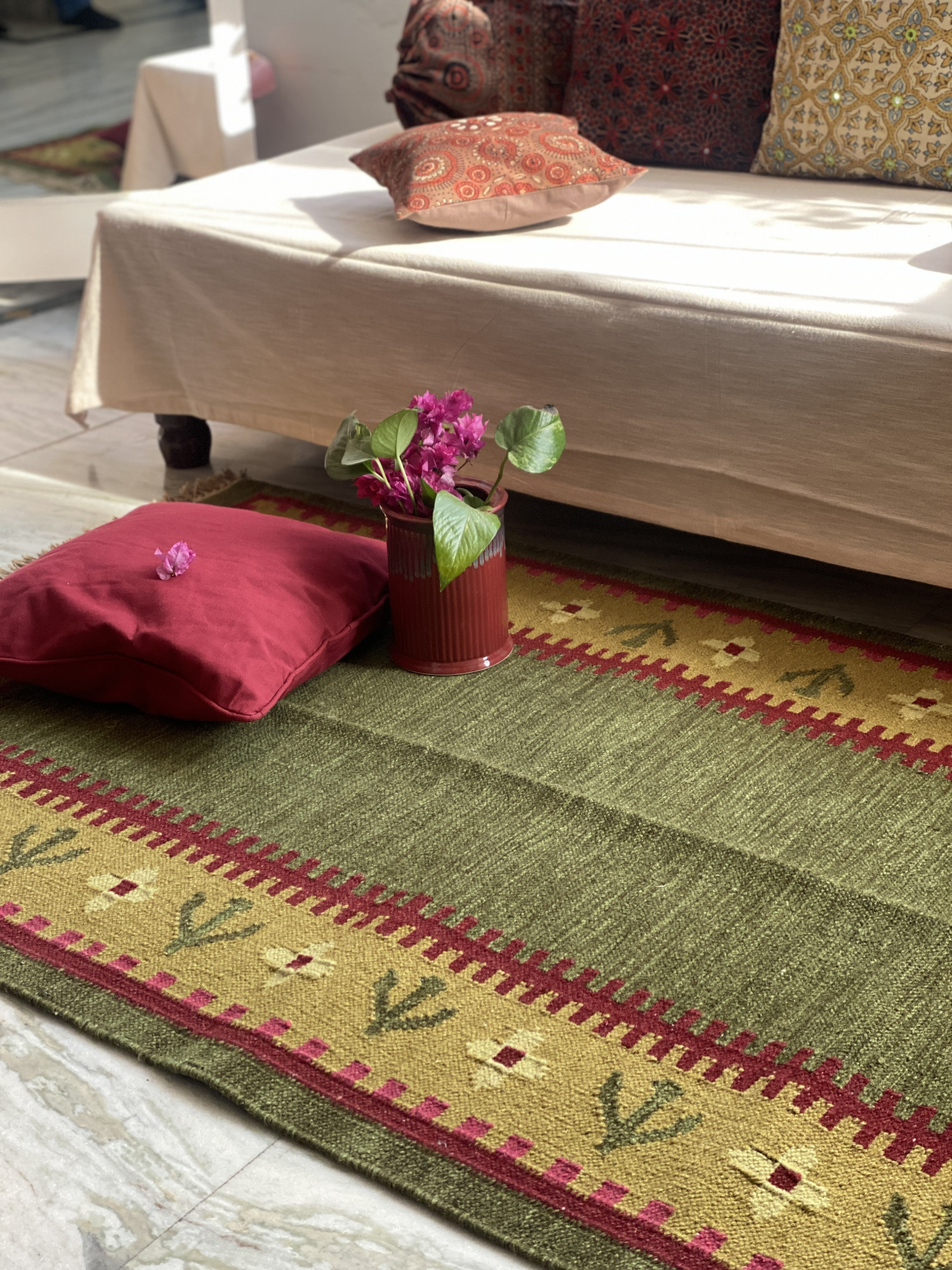 GREEN WOOL & COTTON HAND WOVEN DURRIE WITH FLORAL MOTIFS.