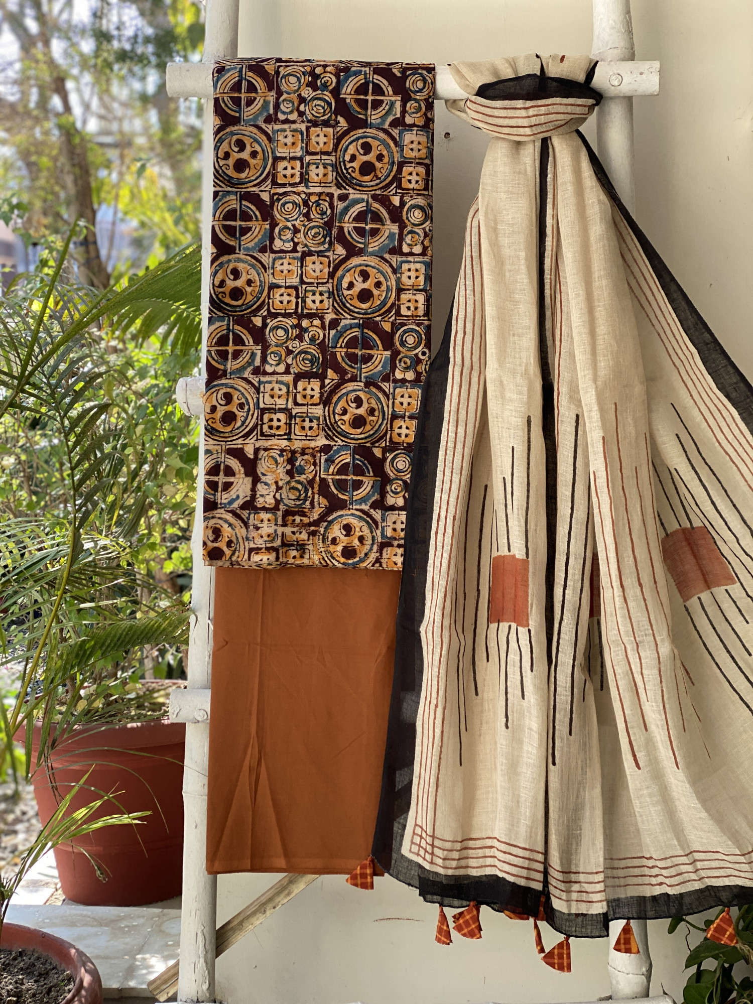 MULTI COLOUR HAND BLOCK PRINT COTTON SHIRT AND A RUST PLAIN WOVEN COTTON BOTTOM, PAIRED WITH A BEIGE GEOMETRIC PATTERN HAND BLOCK PRINTED COTTON LINEN DUPATTA.
