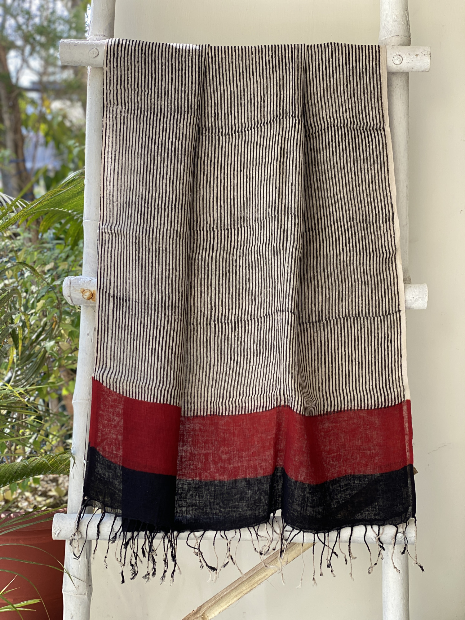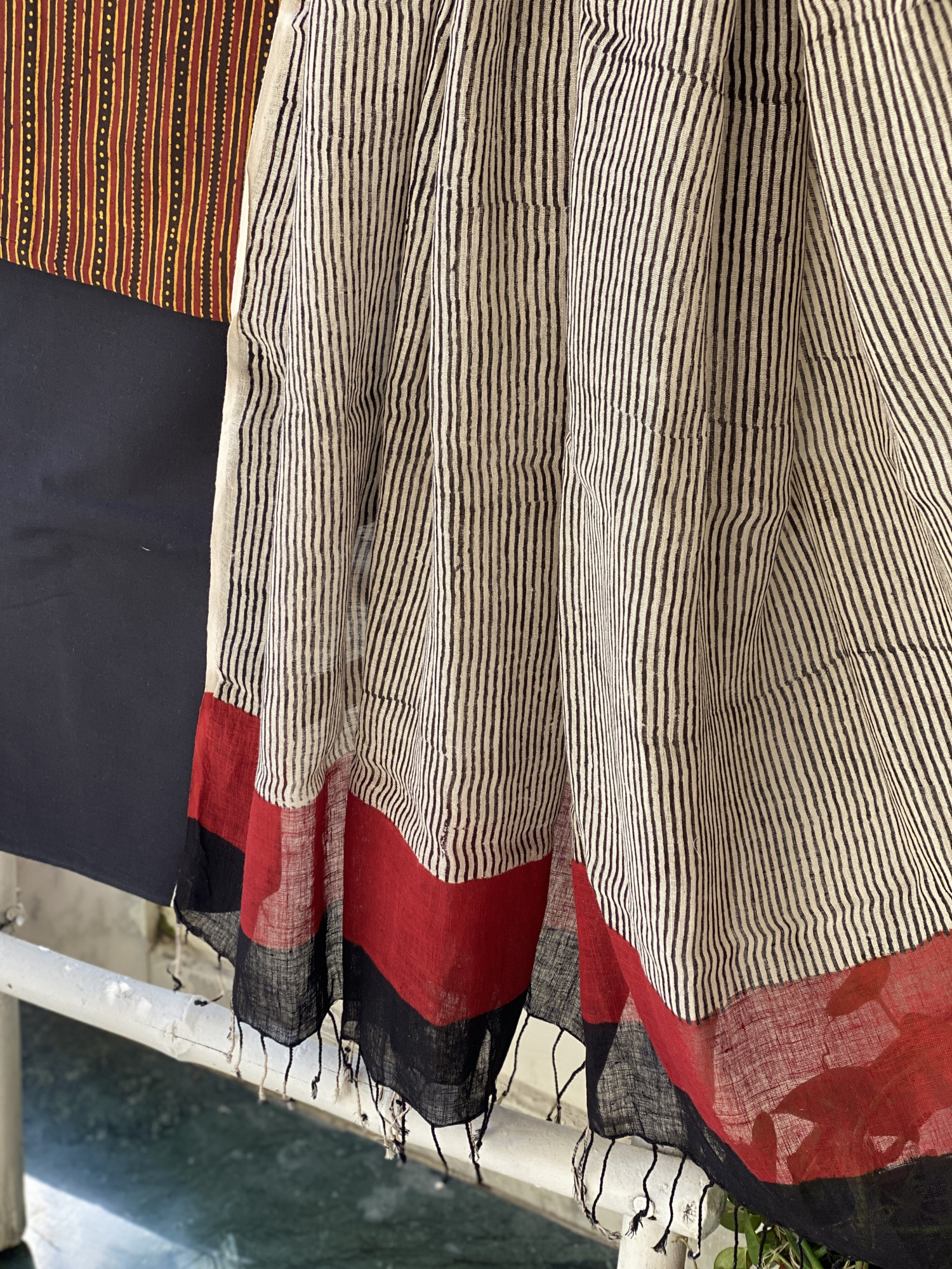 MULTI COLOUR AJRAKH HAND BLOCK PRINT COTTON SHIRT AND A BLACK PLAIN WOVEN COTTON BOTTOM, PAIRED WITH A BEIGE GEOMETRIC PATTERN HAND BLOCK PRINTED COTTON LINEN DUPATTA.